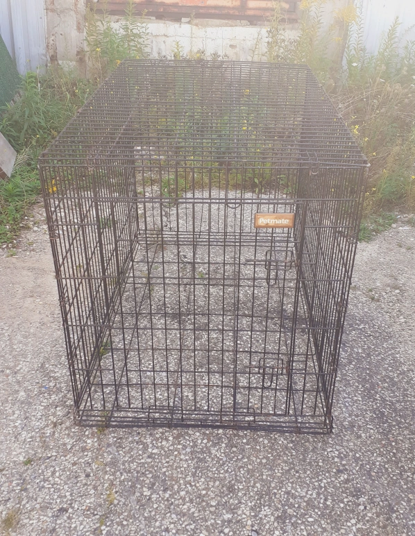 This is a large dog crate in good condition. It has two doors and is great for a large dog or multiple small dogs.