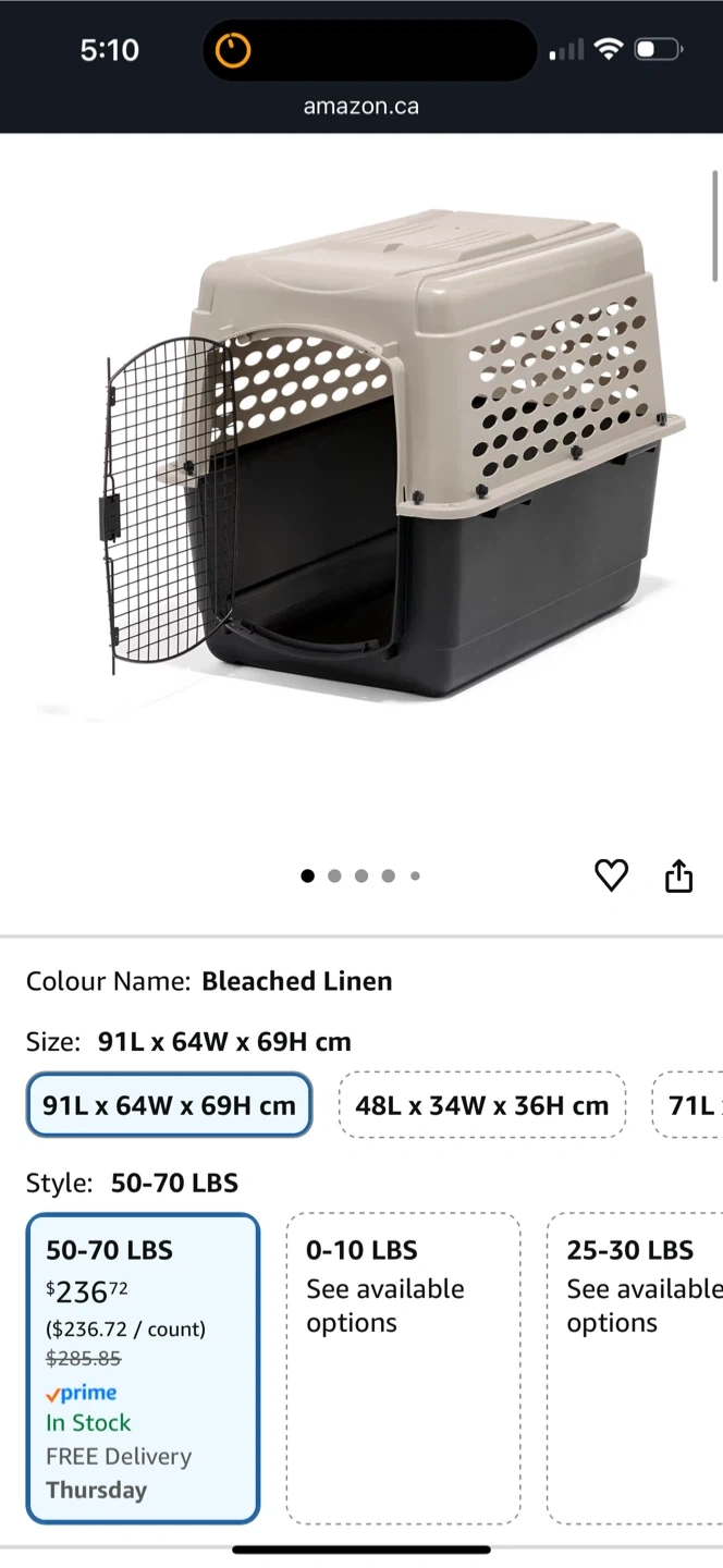 26Selling a Petmate pet kennel! It's in lightly used condition and ready for your furry friend's adventures. The size is 91L x 64W x 69H cm, suitable for pets weighing 50-70 lbs.