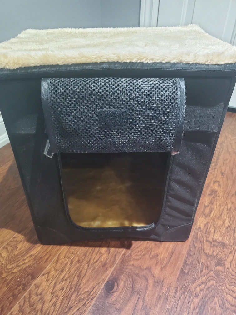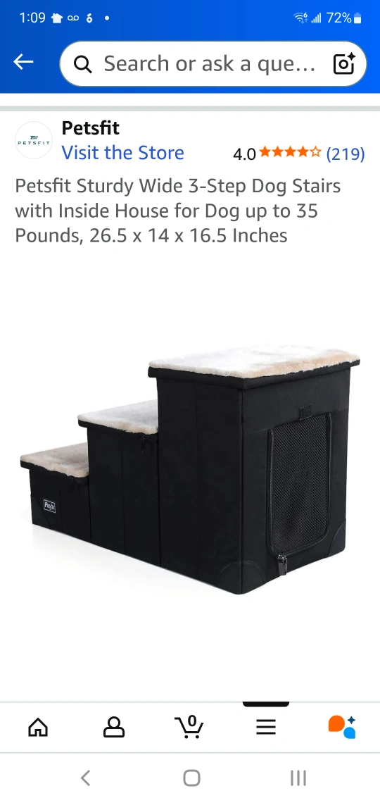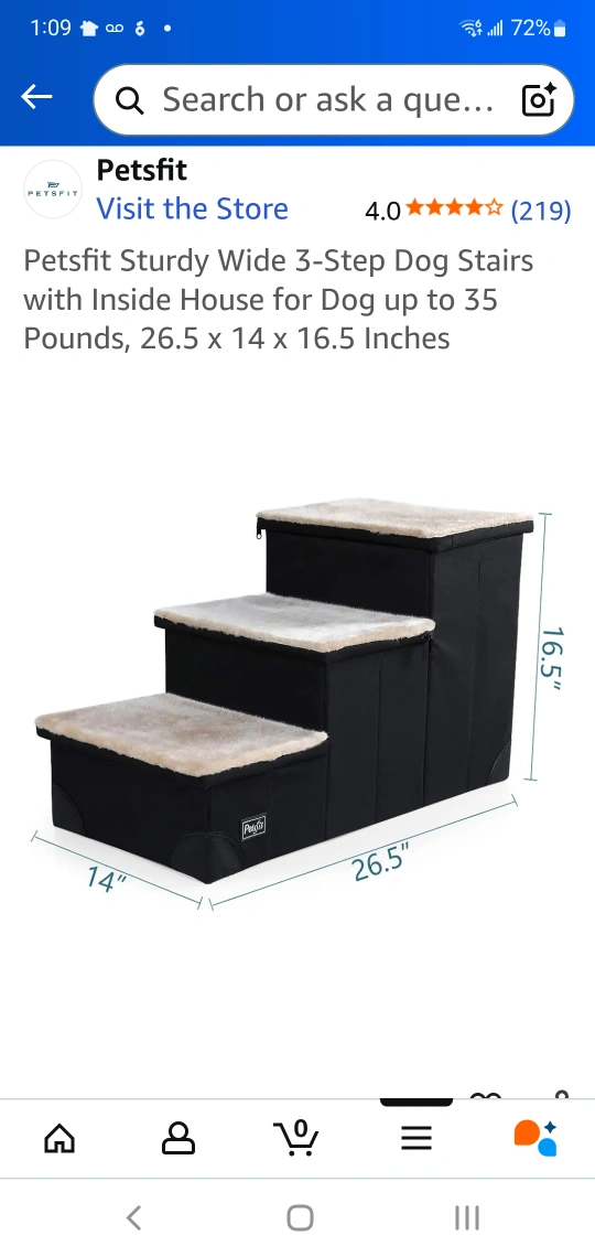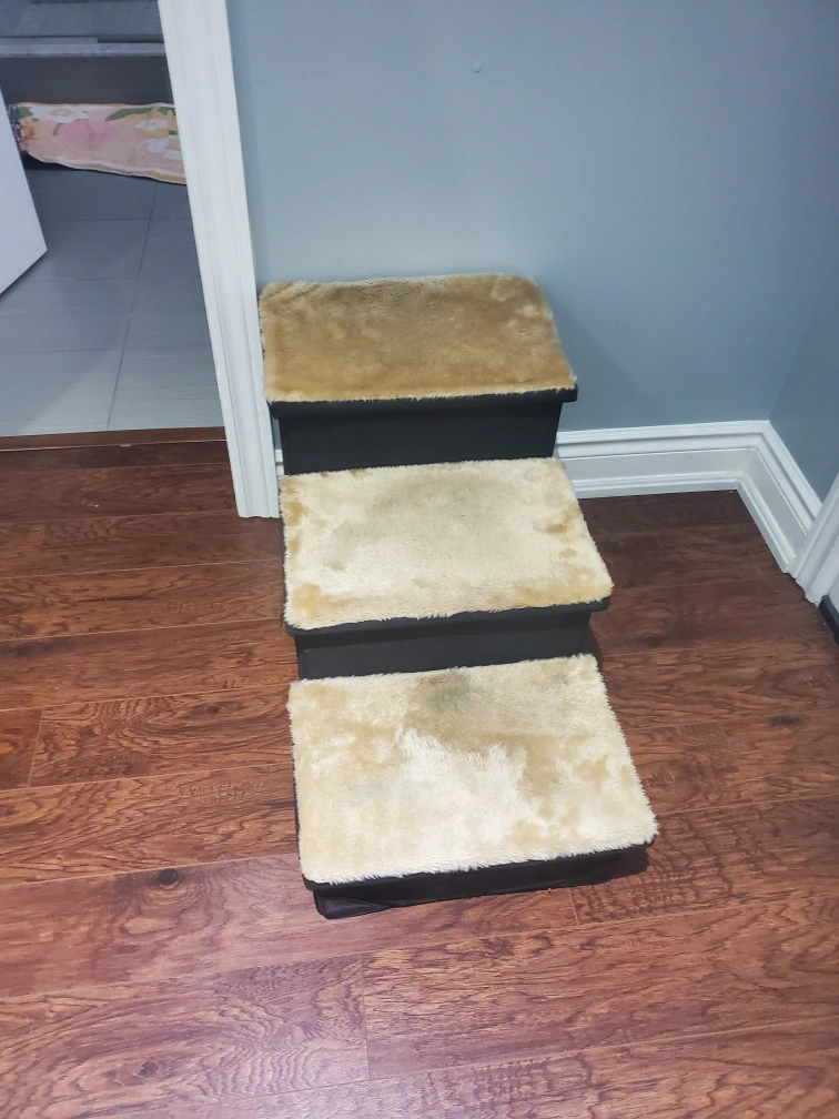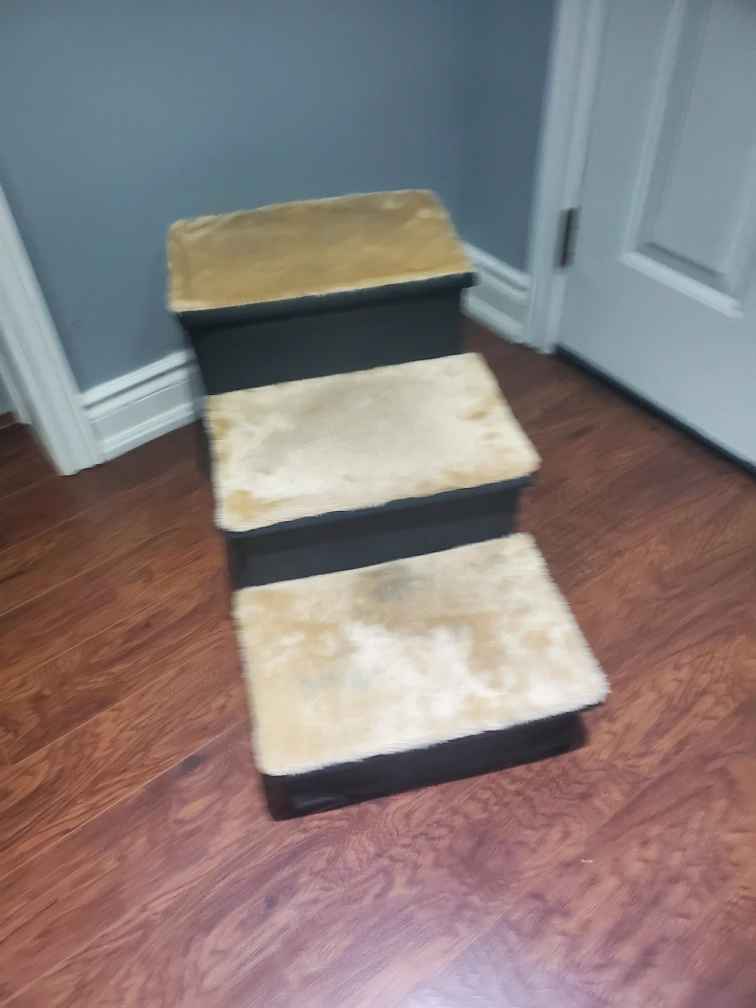 gently used still in good condition. foldable when not in use. Selling a Petsfit 3-step dog stairs in good condition! It's sturdy and wide, perfect for dogs up to 35 pounds. The dimensions are 26.5 x 14 x 16.5 inches. Also has an inside house!