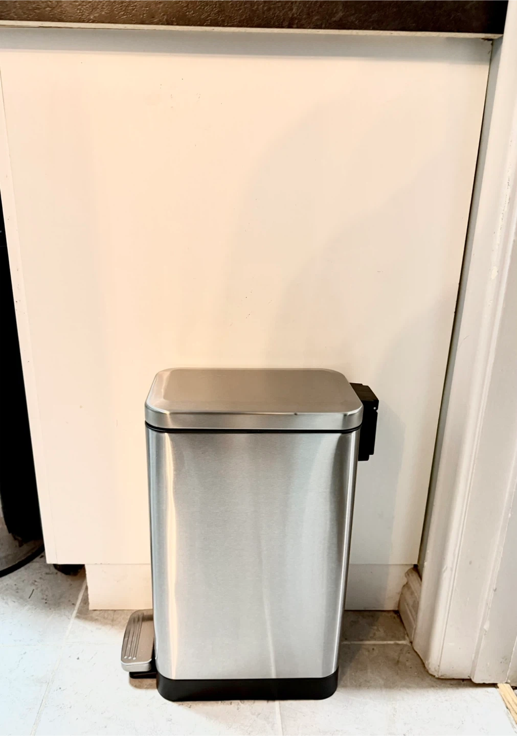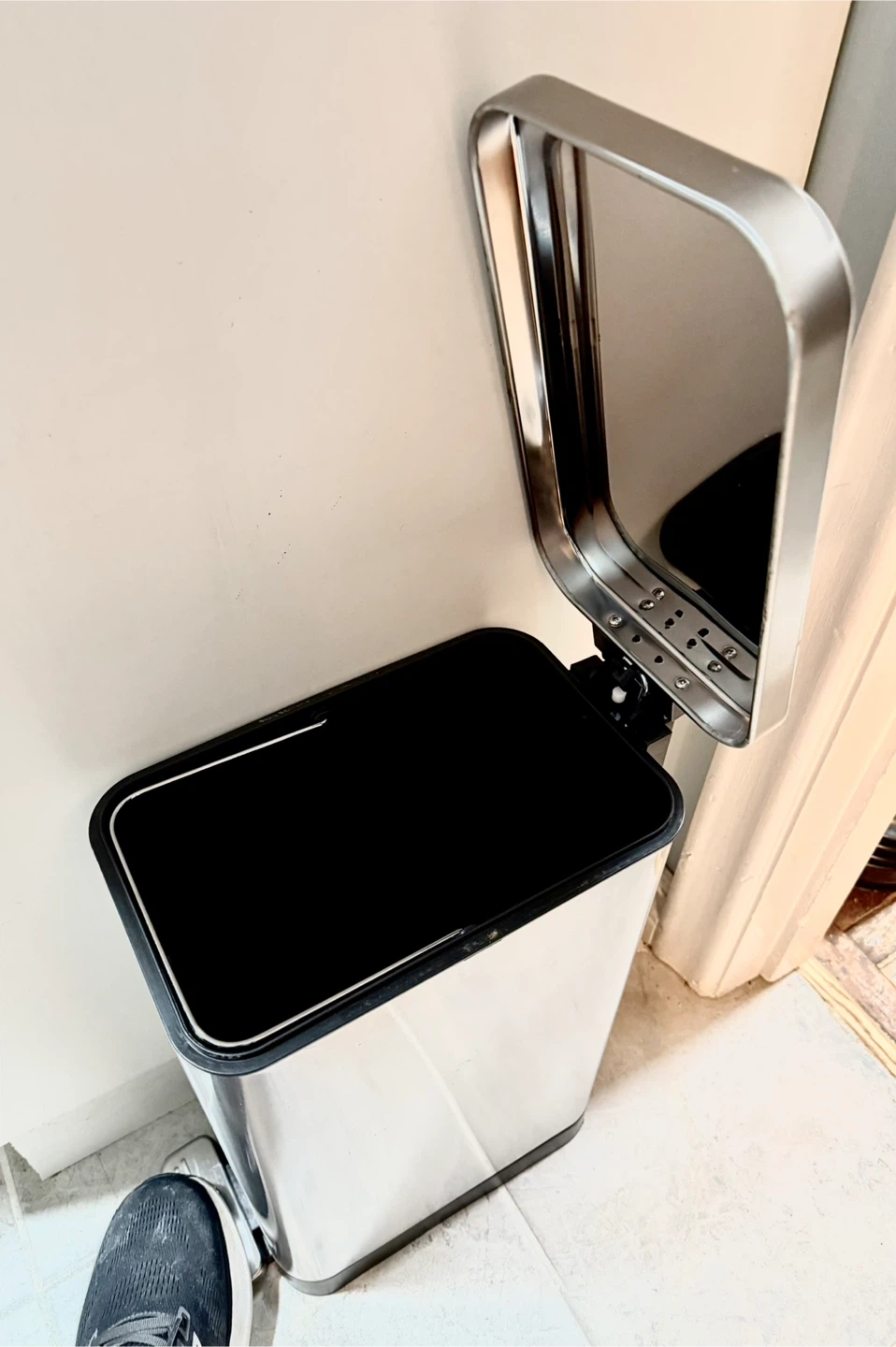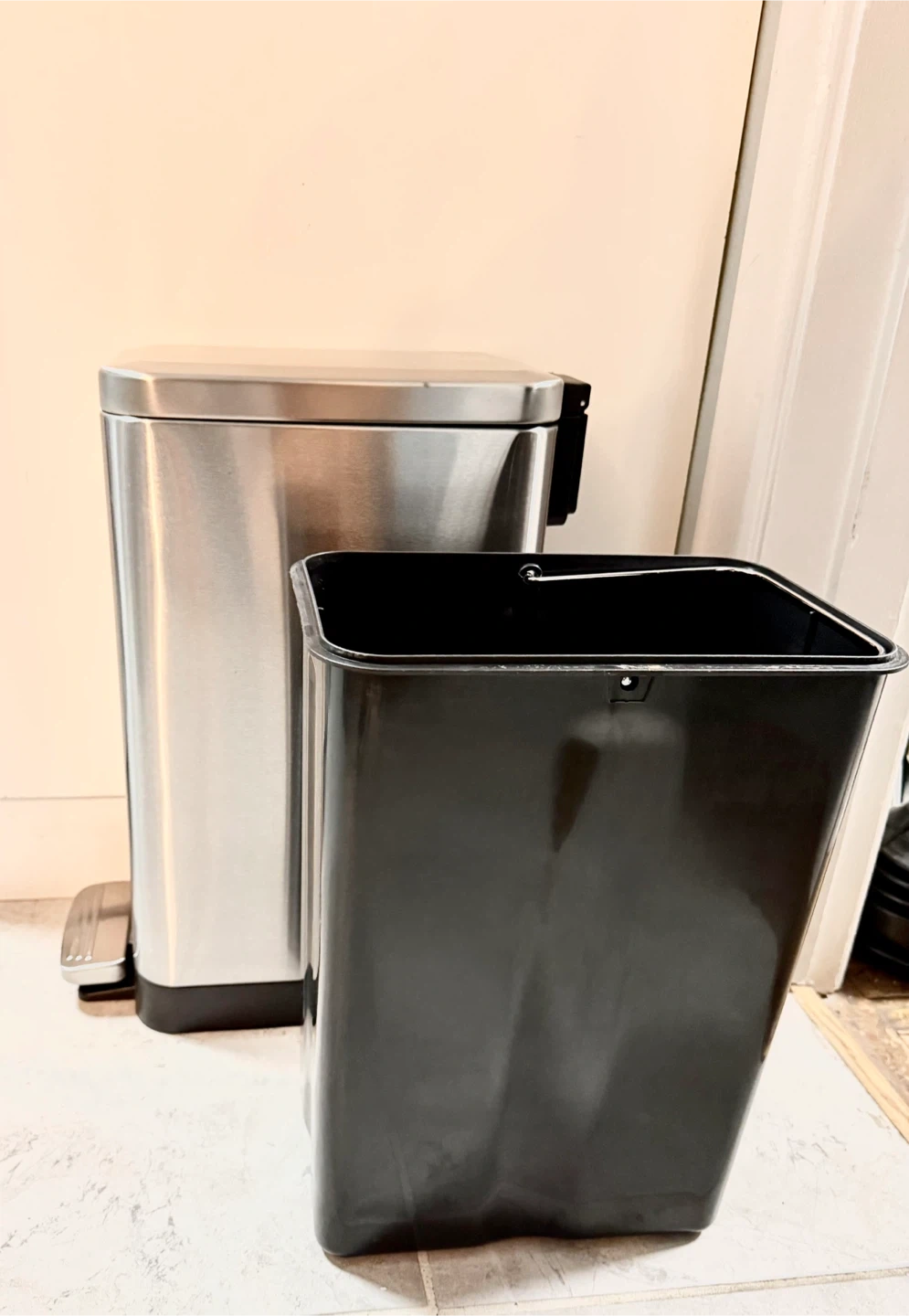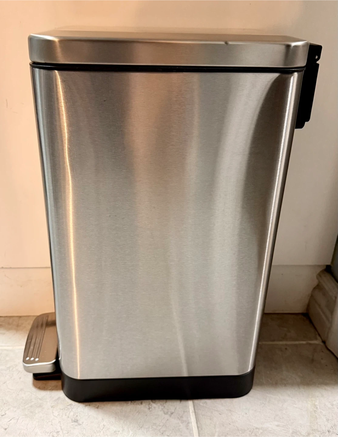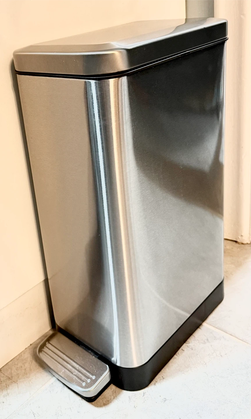 This is a stainless steel step trash can. It features a soft-close lid and a foot pedal for hands-free operation. The liner is removable for easy cleaning. It's a good size for a kitchen or bathroom.