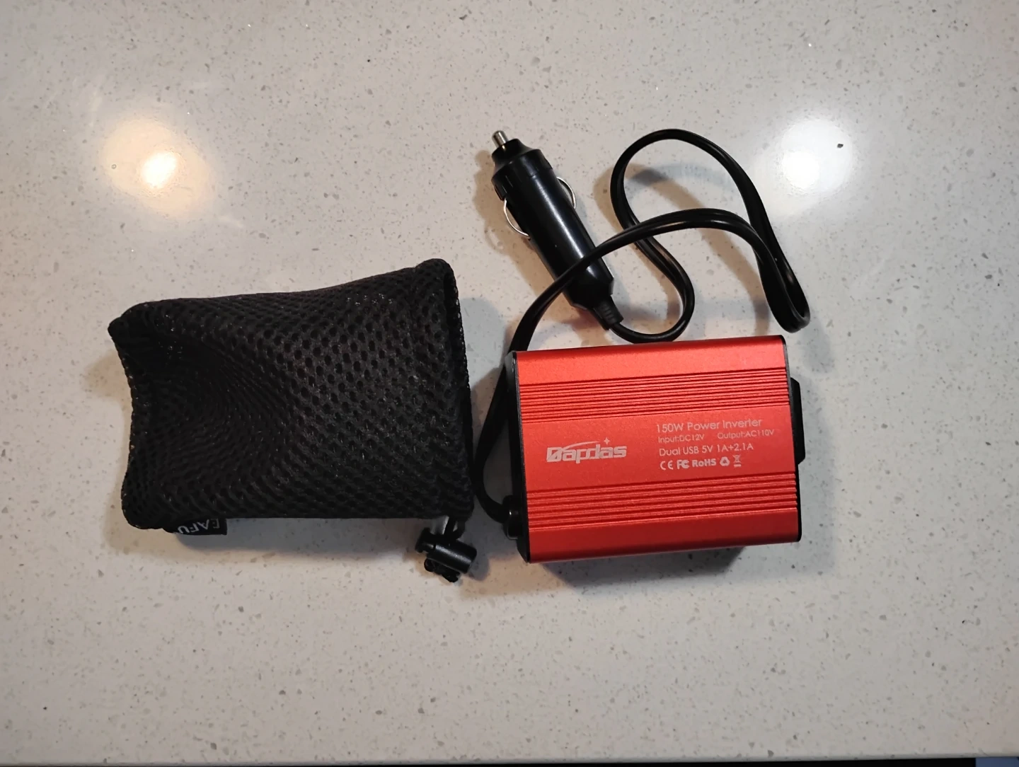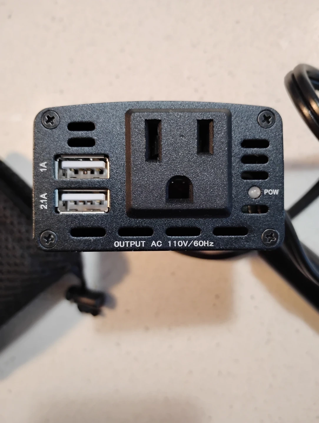 Comes with dual USB ports, one 1A and one 2.1A. Includes a standard AC outlet. Perfect for charging devices on the go.