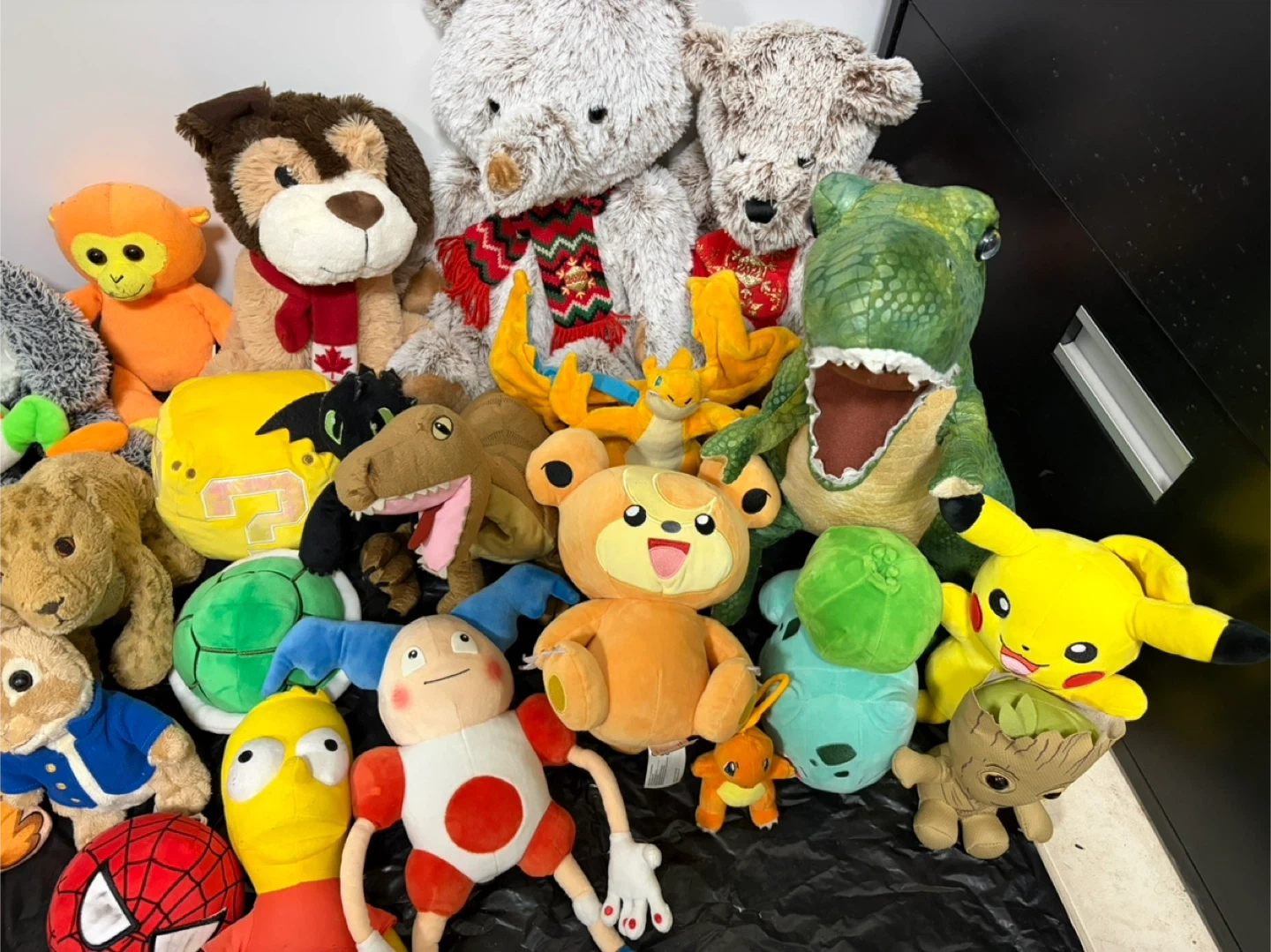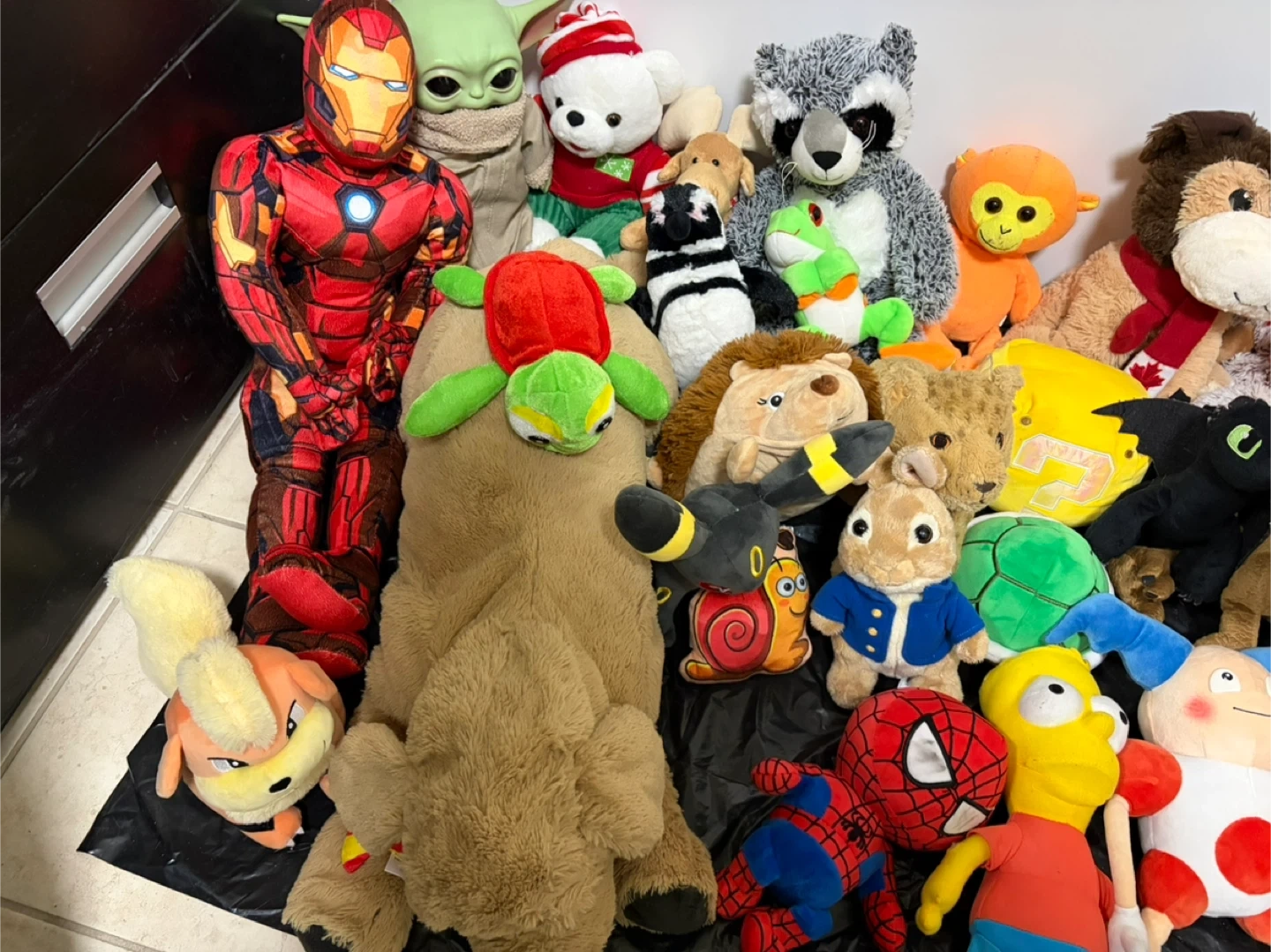 A fun collection of various plush toys including characters like Spiderman, Pikachu, Yoda, and Iron Man. Great for collectors or kids who love stuffed animals!