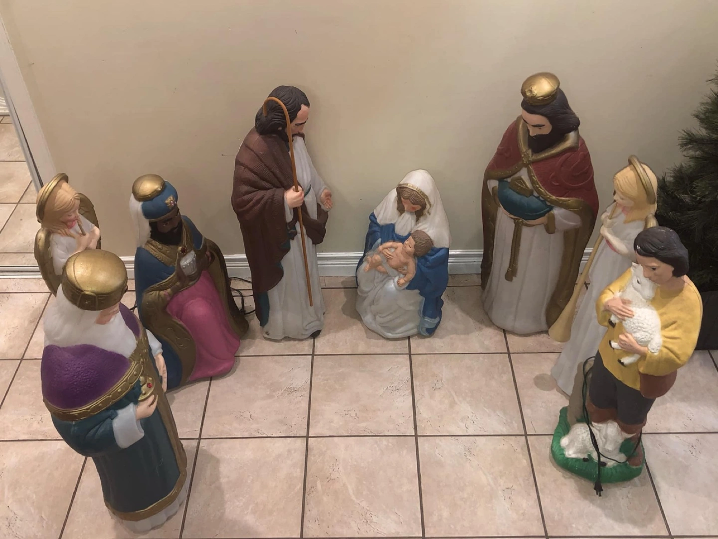 Vintage blow mold Nativity set, includes 8 figures, excellent condition. All light up. Includes Mary, Joseph, baby Jesus, 1 shepherds, three wise men, and 2 angel.