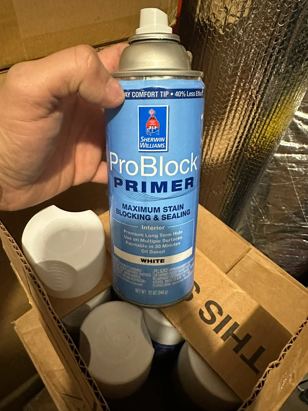 6 pack , Sherwin Williams ProBlock primer spray paint. Maximum stain blocking and sealing for interior surfaces. Oil-based formula in white. Includes comfort tip for 40% less effort. Net Wt. 12 oz.