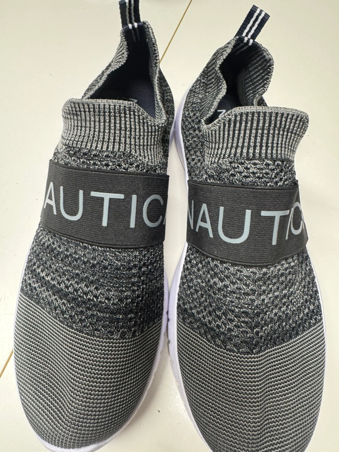 Grey and black slip-on sneakers. Knit fabric upper. Nautica logo on the strap. Comfortable and stylish.