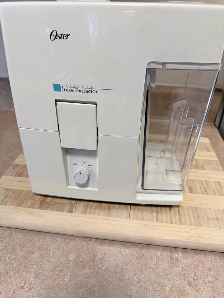 Oster Designer Juice Extractor in good condition. Strong motor with Low/High settings, clear juice container, and easy‑clean parts. Works well and ready for fresh fruit/veg juices.