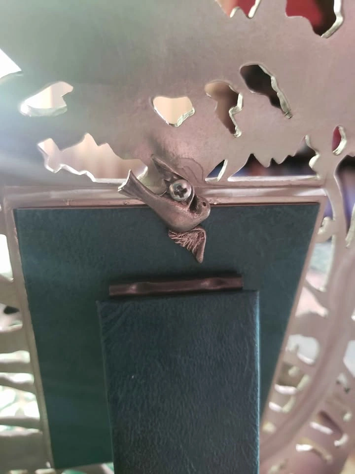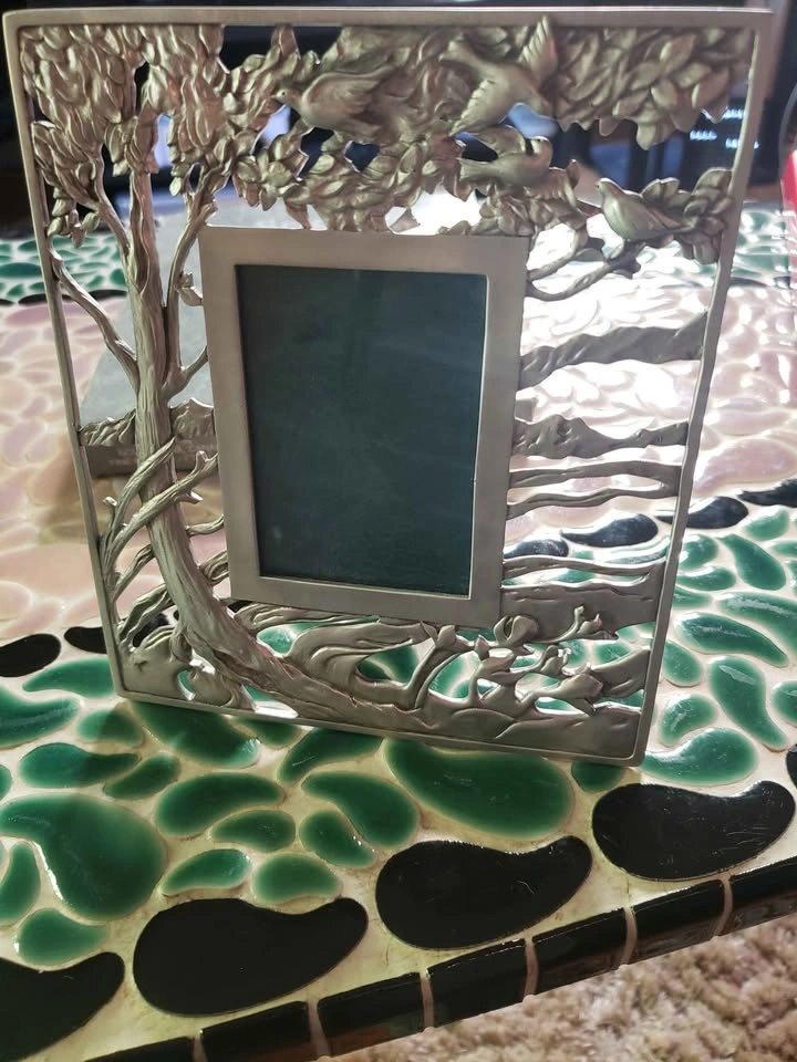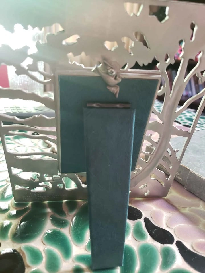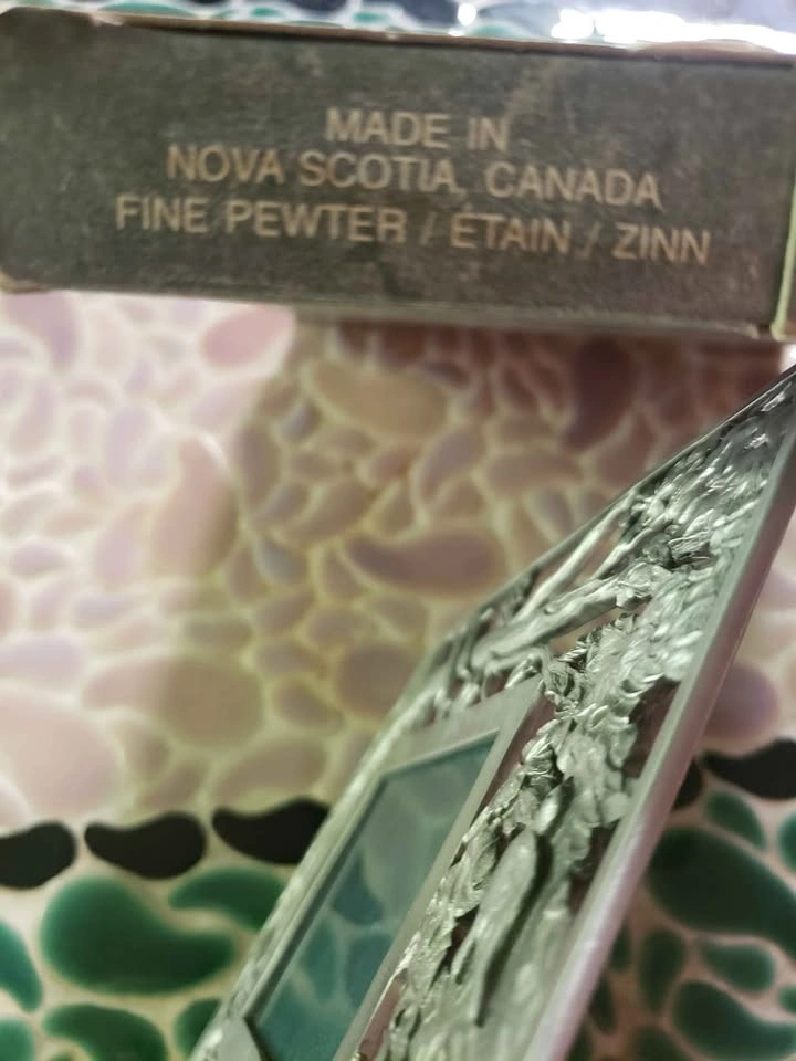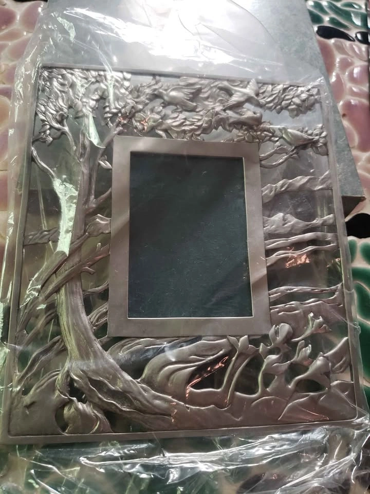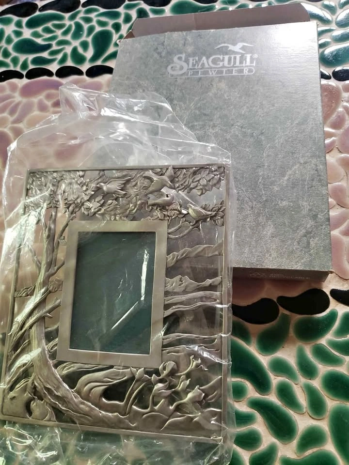 25Rare find. Never used. Comes in box. Fine pewter Seagull brand picture frame made in Nova Scotia. Intricate cut out carving of tree with birds and flowers. Green leather backing with a delicate little bird clasp on the back. Very detailed and good quality. Total frame is 6.5 " tall by 5.5 " wide. It will hold a 2" by 3" photo in the center of the landscape carving. Great for a school picture or baby picture or other keepsake photo. Would make an excellent gift. Cross posted. Pick up in Upper Lonsdale North Vancouver.