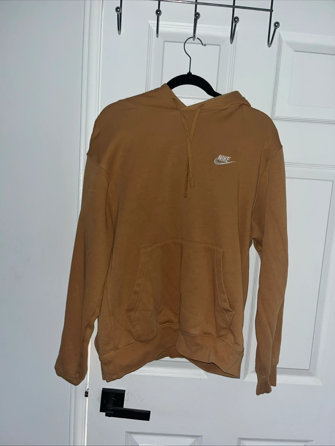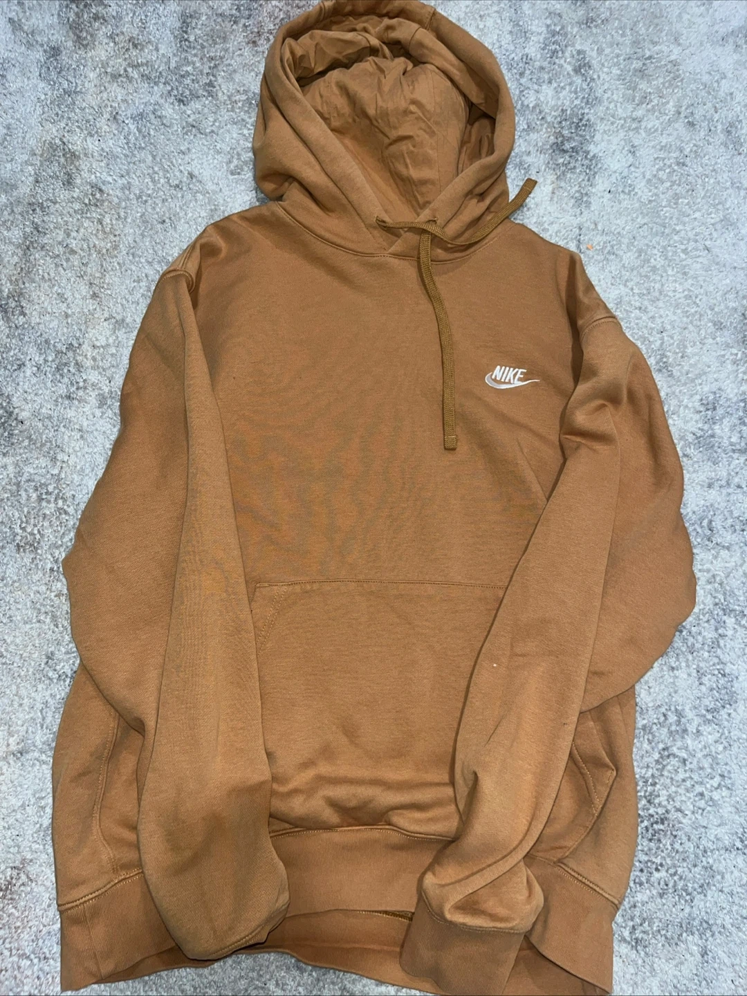 This is a Nike pullover hoodie in a warm brown colour. It features a front kangaroo pocket and an adjustable drawstring hood. A classic Nike swoosh logo is embroidered on the chest. It's made from a comfortable blend of cotton and polyester.