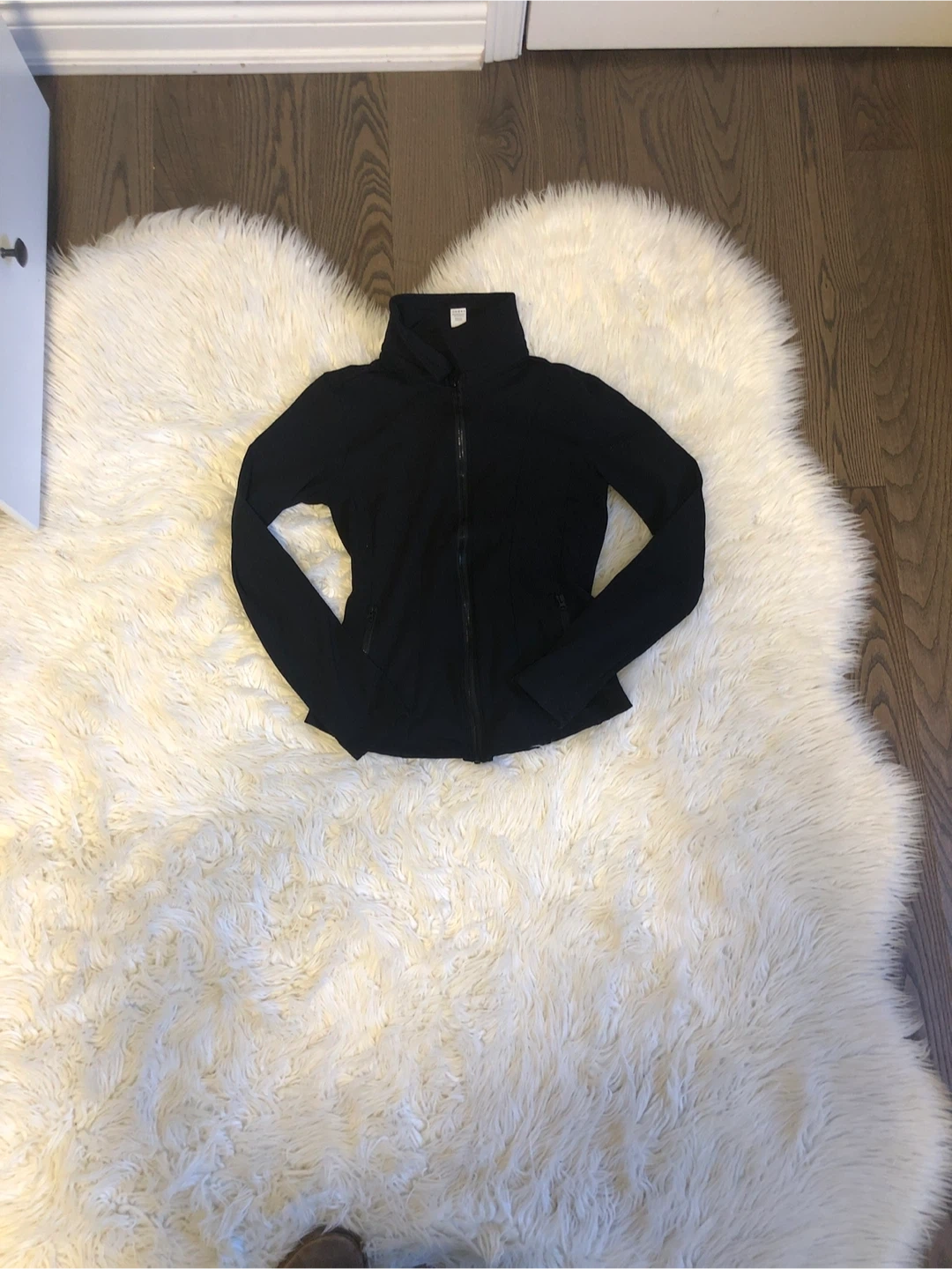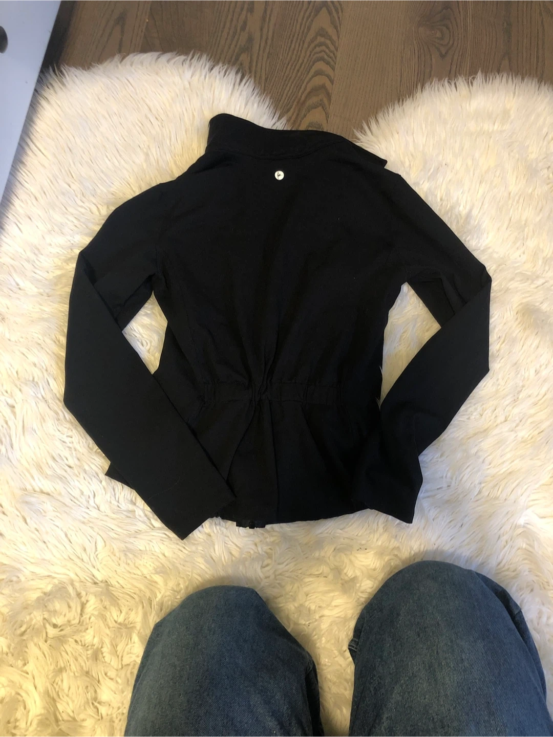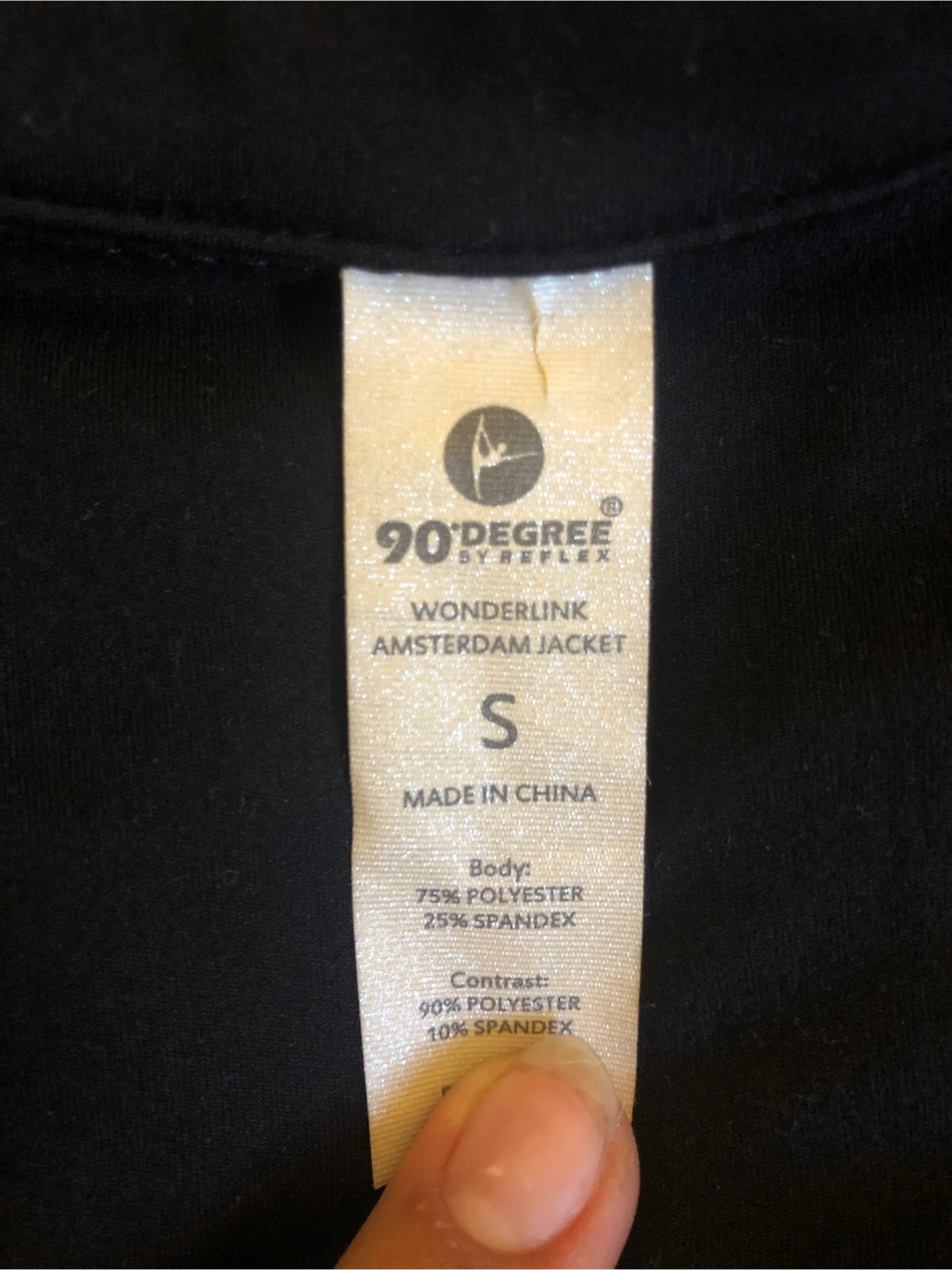 This is a black 90 Degree by Reflex Amsterdam jacket. It's made from a 75% polyester and 25% spandex blend for the body, with a 90% polyester and 10% spandex contrast. It features a zippered front and a drawstring at the waist for adjustable fit. This jacket is great for workouts or casual wear!