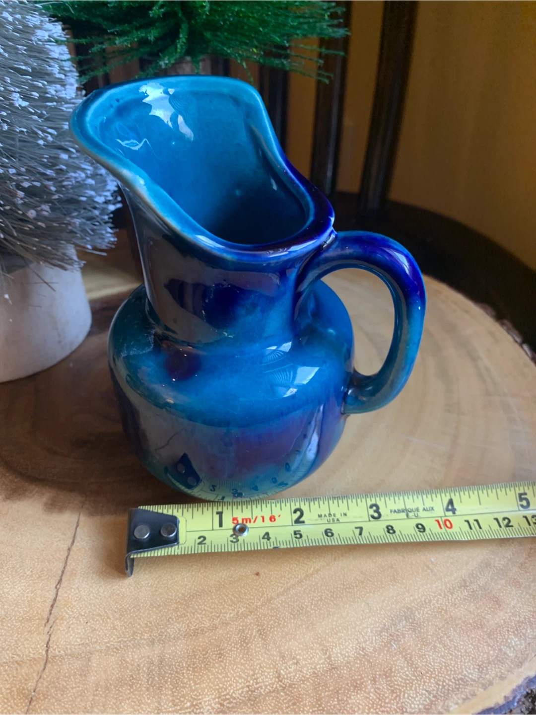 This is a cobalt and teal little ceramic pitcher from La Casalinga. It has a glossy finish and a classic pitcher shape with a handle and spout. The glaze is beautiful and there are no chips or cracks but a few missed glazing spots. This would look fabulous on a bookshelf or stack with little dried flowers or as a pen holder on a desk.