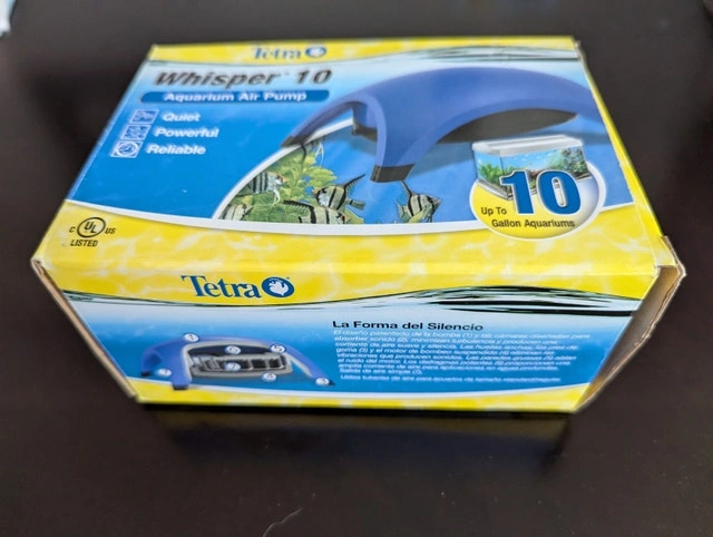 Tetra Whisper 10 Aquarium Air Pump, Brand New, never used Recommended for aquarium up to 10 gallons POWERFUL: Tetra Whisper Air Pump provides dependable airflow to your aquarium QUIET: Patented dome shape, suspended motor and sound-dampening chambers for quiet operation PROVIDES OXYGEN AND WATER MOVEMENT: Keeps underwater pets happy ADD VISUAL INTEREST: Bubbles catch light and add an element of movement to your fish tank Reduced noise and vibrations; UL approved for both fresh and marine water.