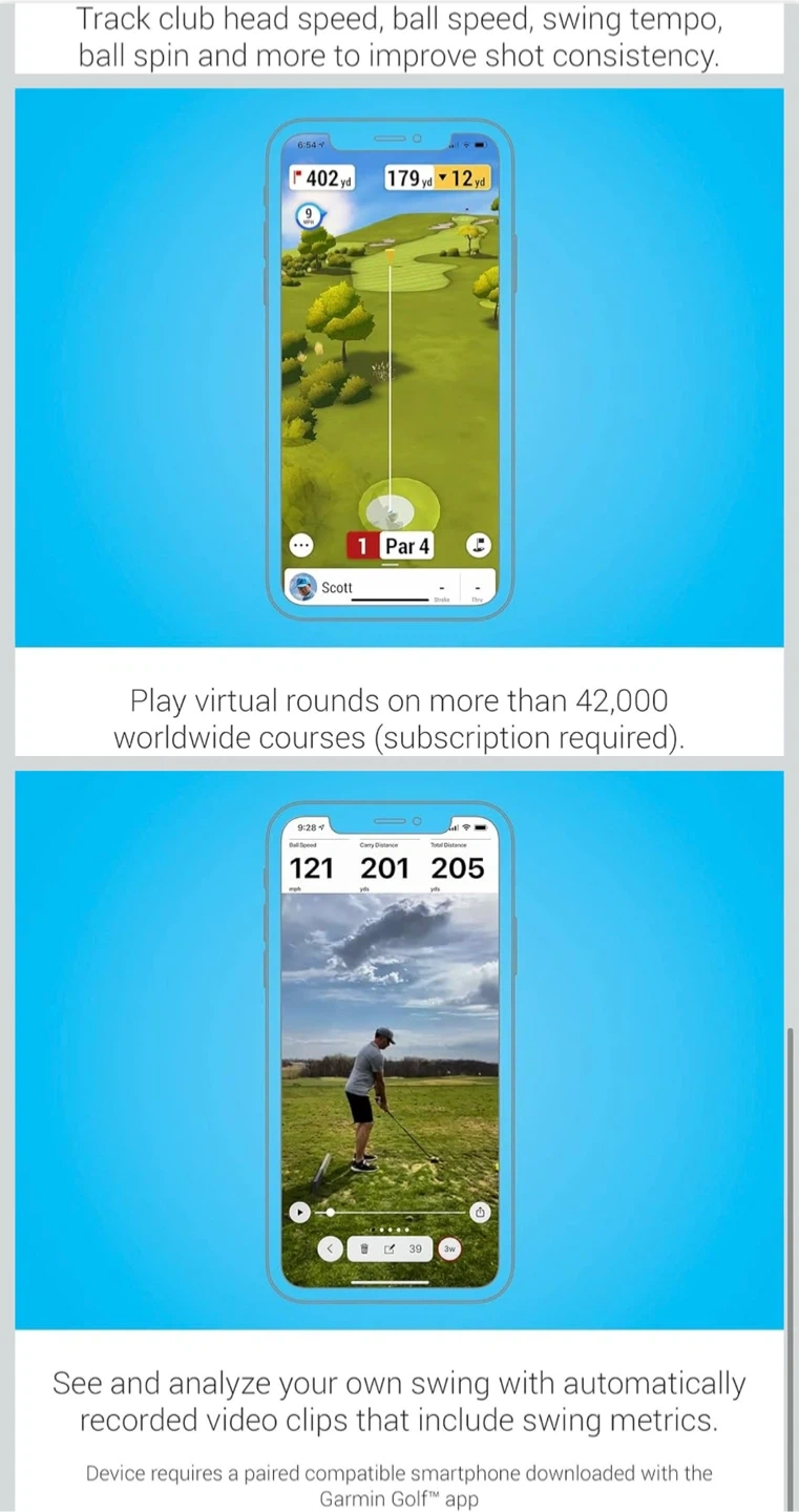 Improve your game at home, indoors, or on the driving range with this portable launch monitor. It tracks club head speed, ball speed, swing tempo, ball spin, and more to help improve shot consistency. Device requires a paired compatible smartphone downloaded with the Garmin Golf™ app.
