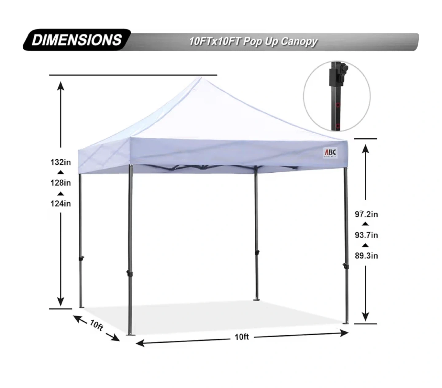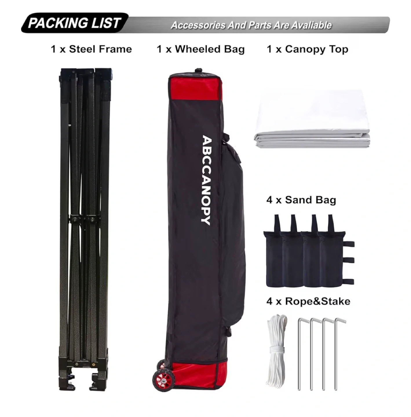 This ABCCANOPY pop up canopy tent is 10ftx10ft and includes a steel frame, canopy top, wheeled bag, and sand bags. It features pre-assembled framing for easy setup. The frame is steel, and the canopy is white. This tent is great for outdoor events and markets!