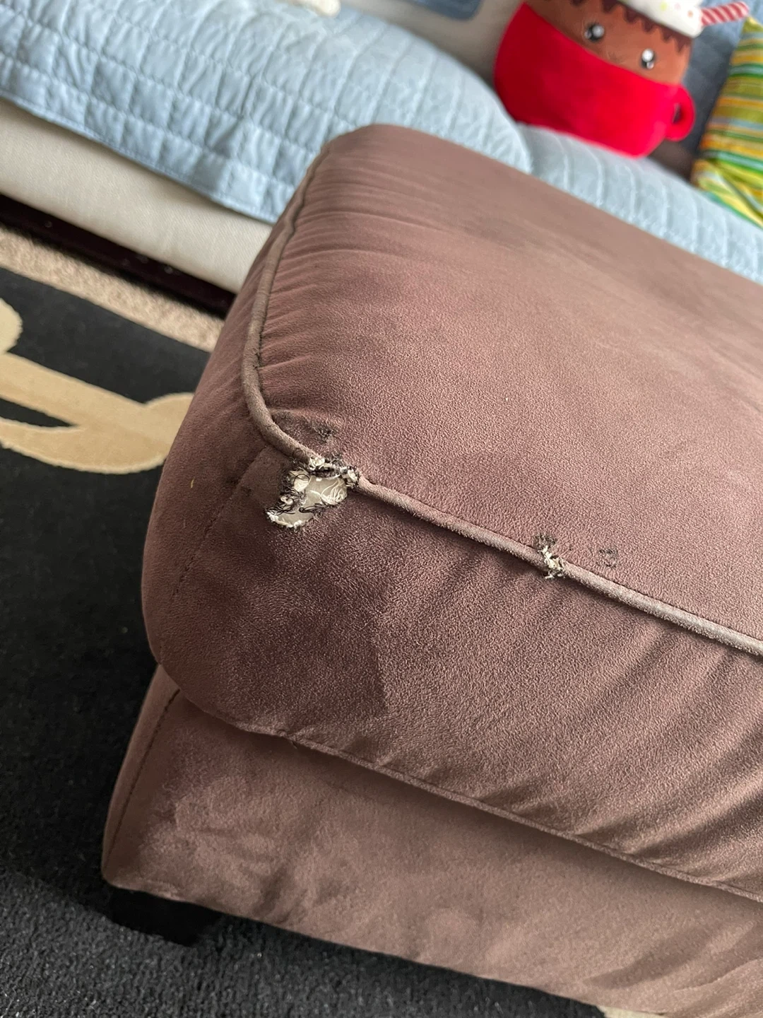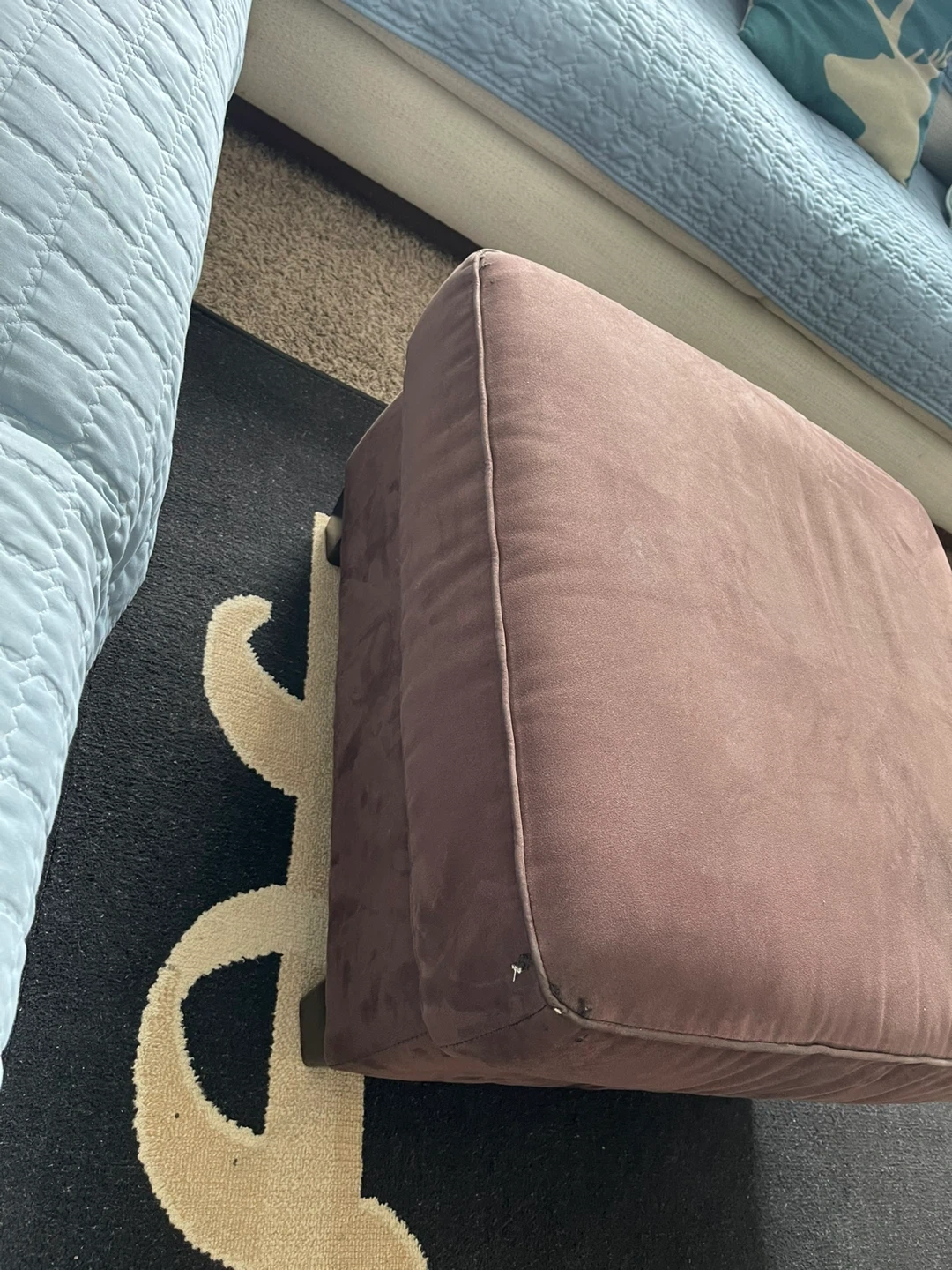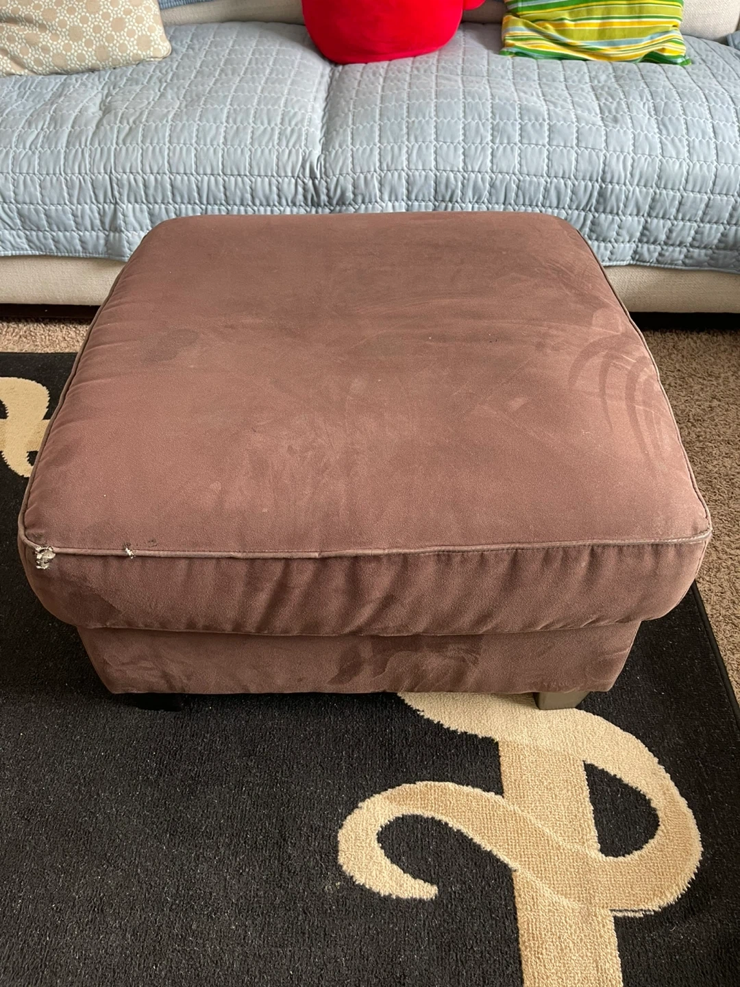 A brown fabric ottoman, perfect for resting your feet. It has some wear and tear on the corners, as shown in the photos.
