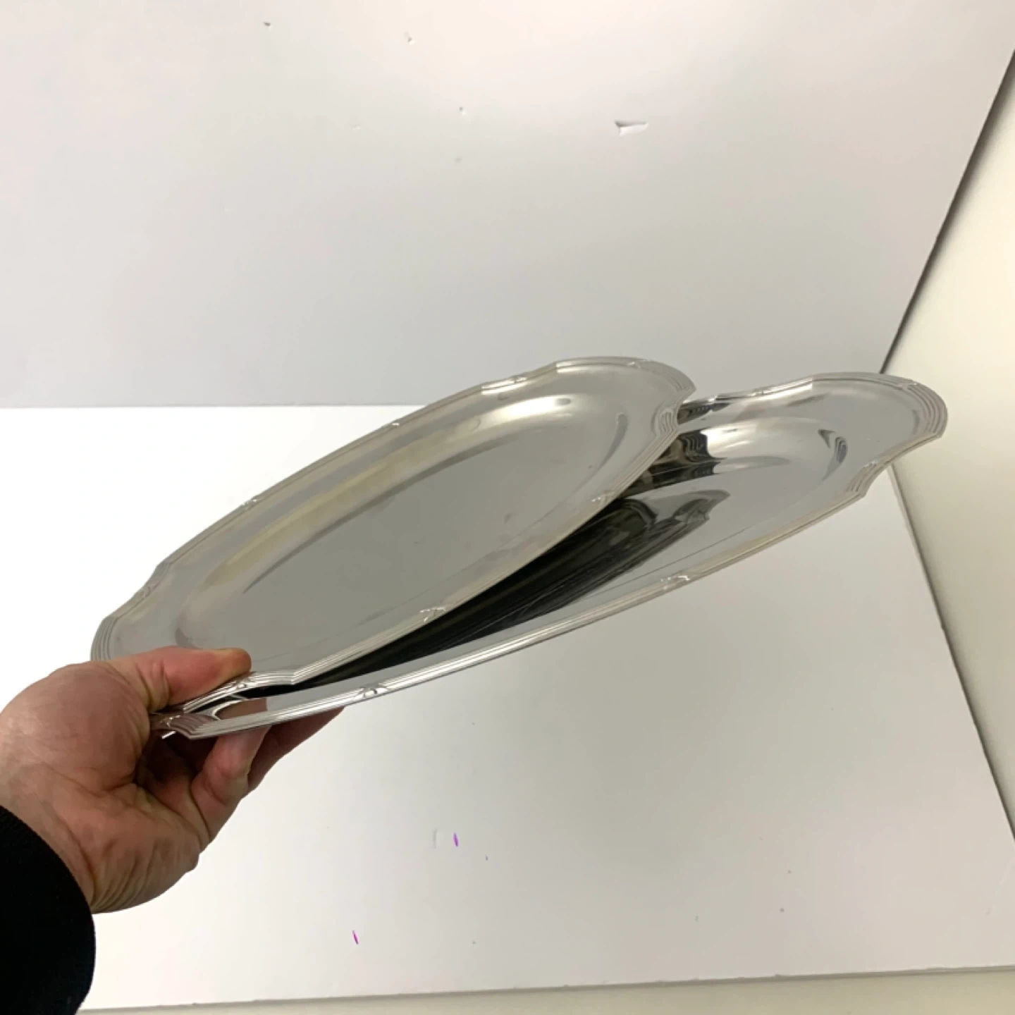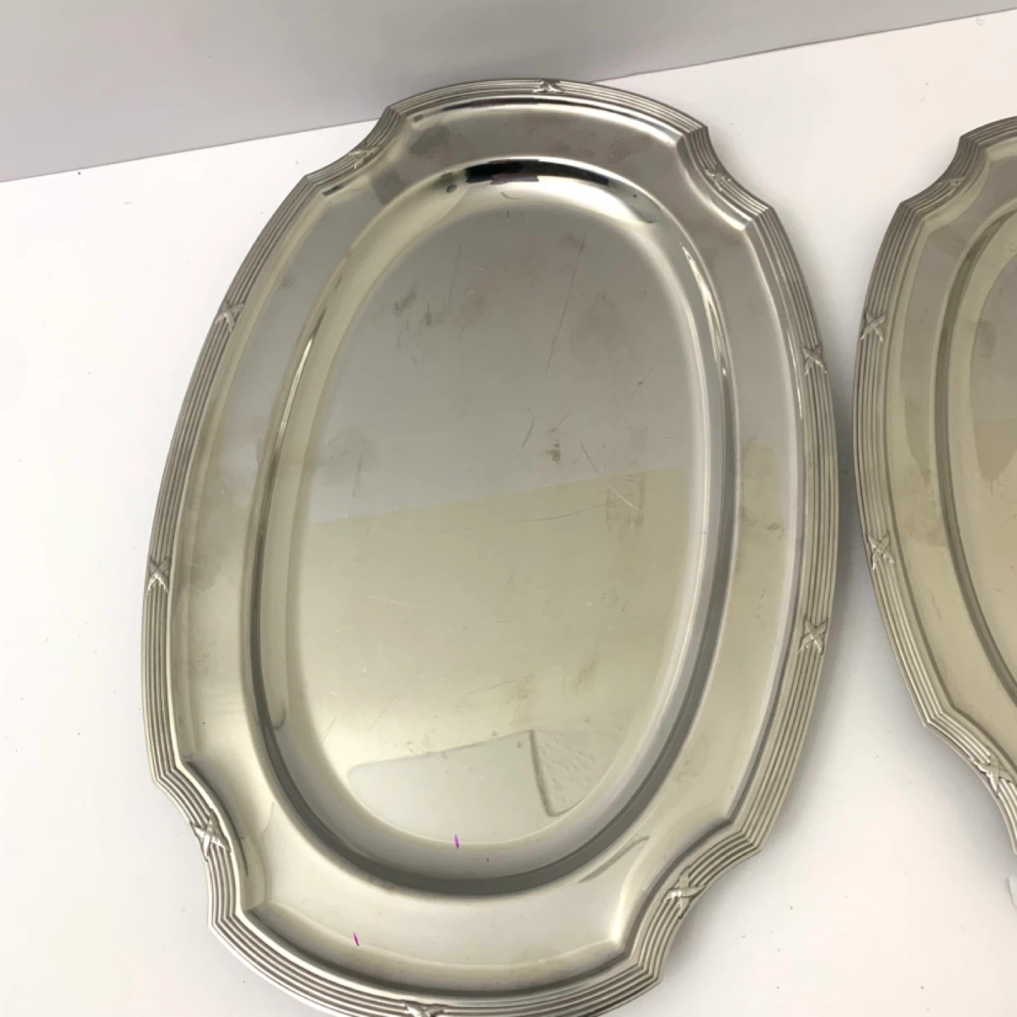 Serving trays set metal silver oval platters – includes 2 trays in different sizes with decorative borders. Great for serving appetizers, desserts, drinks, or as decorative pieces for events and home use. Classic silver-tone finish adds a clean and elegant look.