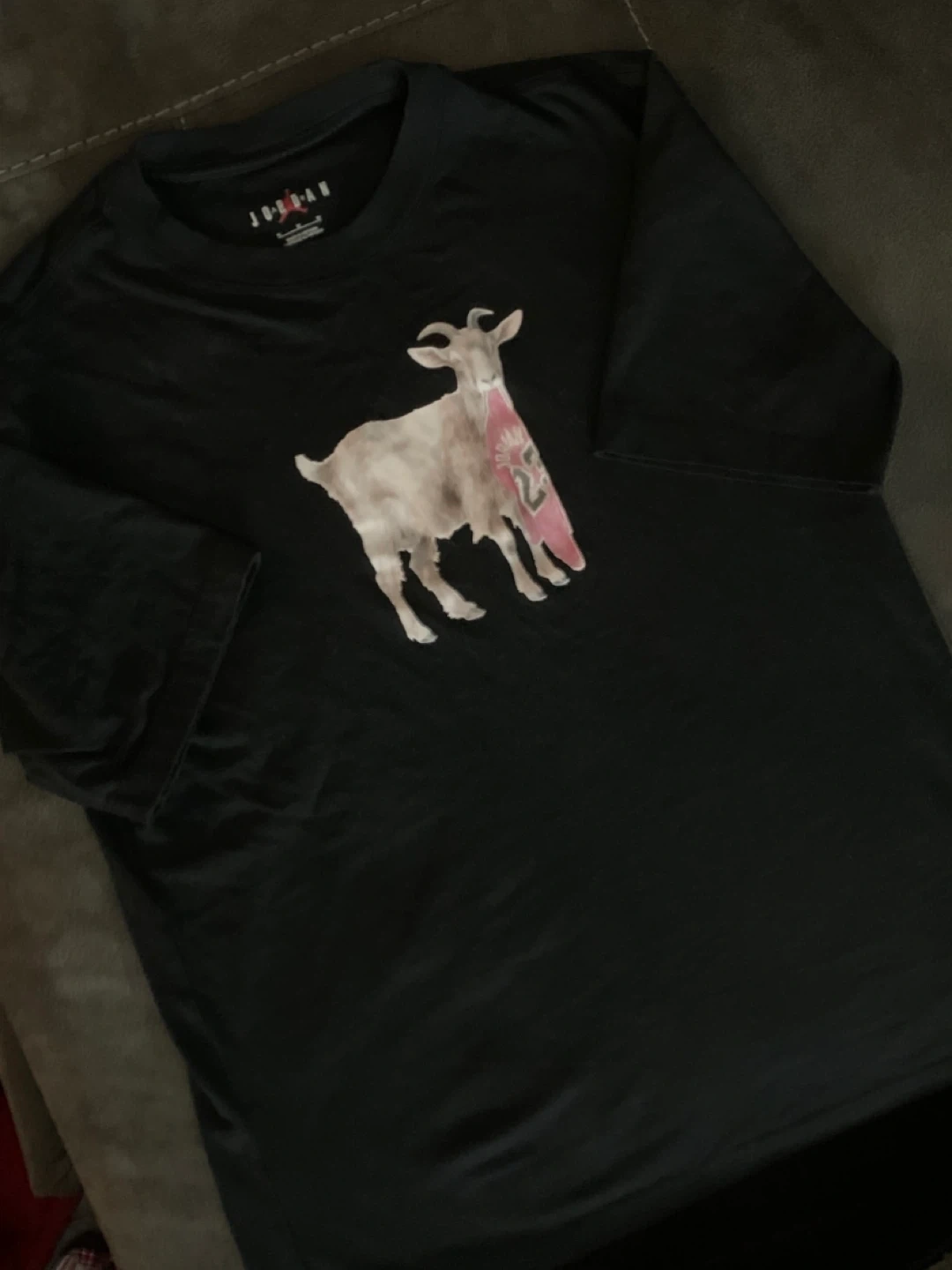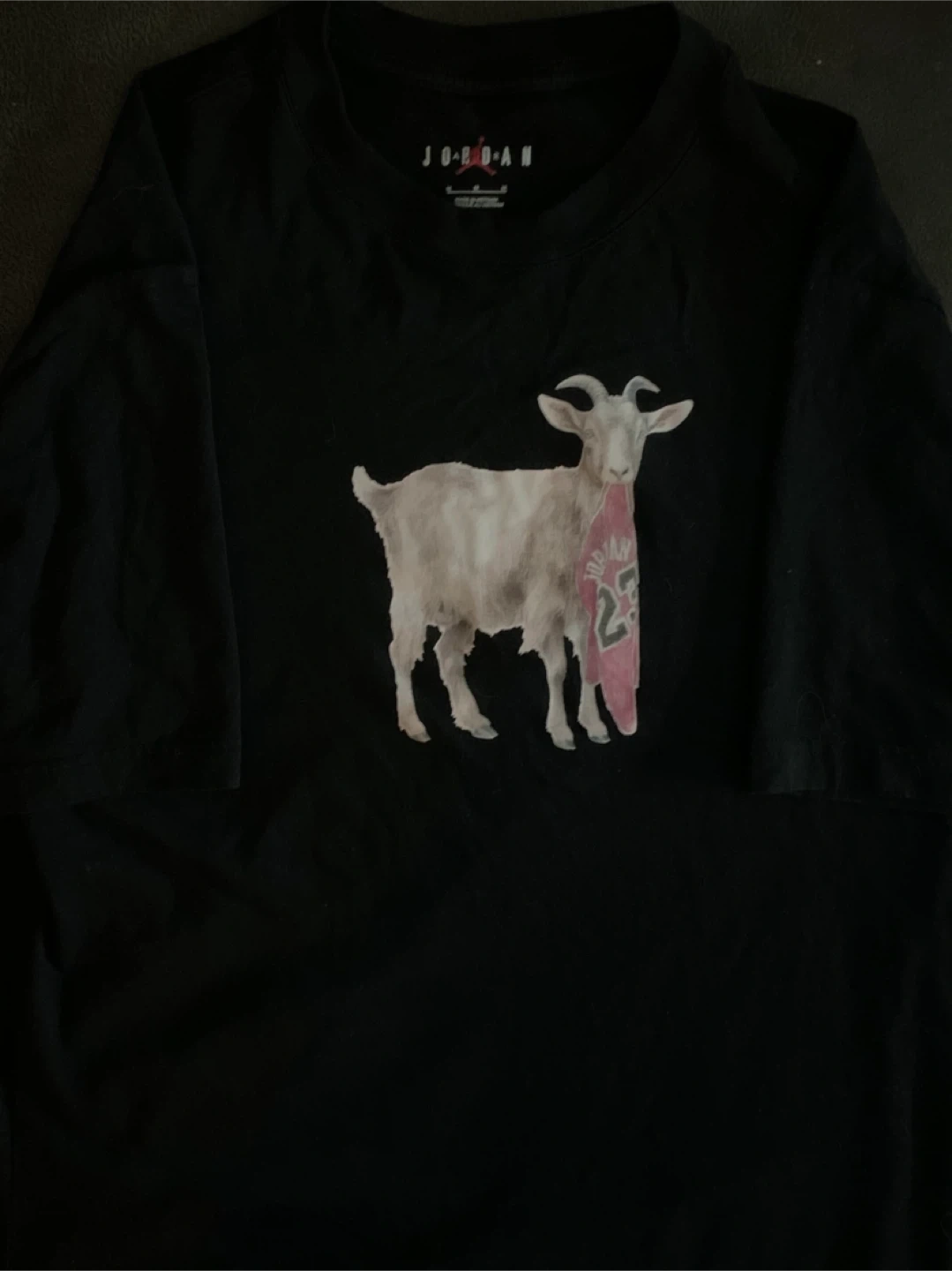 Black Jordan t-shirt with a GOAT graphic on the front. Made in Vietnam. It's a size medium.