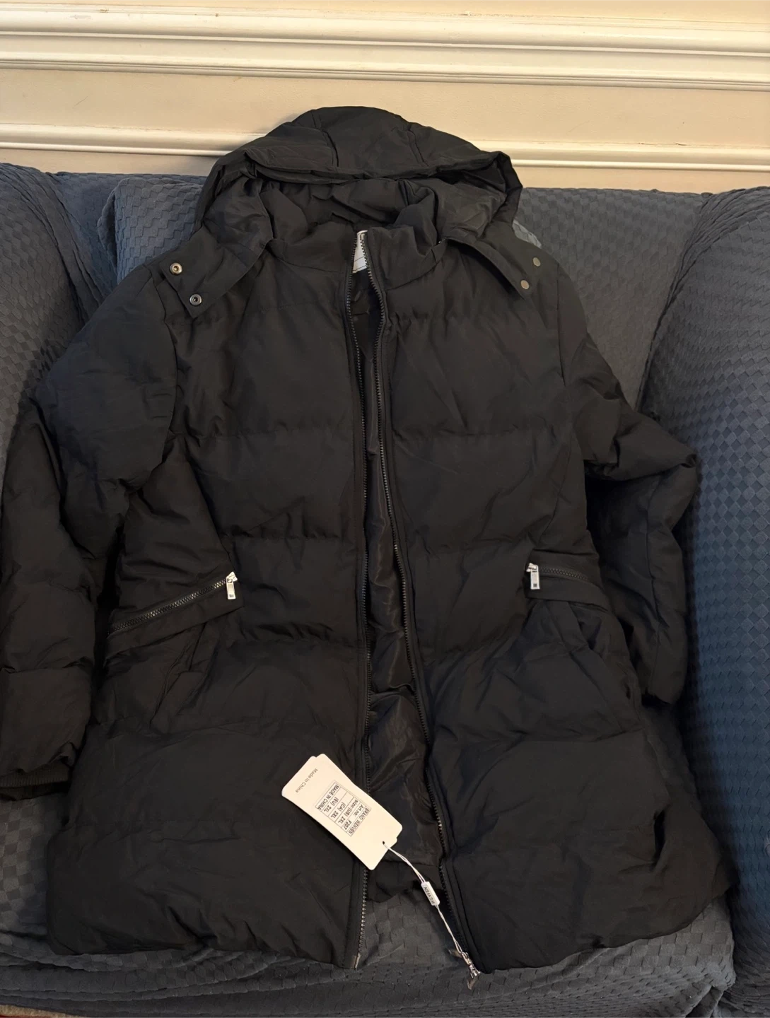 Black puffer coat from BAANO KENVEN. Made in China, size 2XL. Features a hood and zippered pockets.