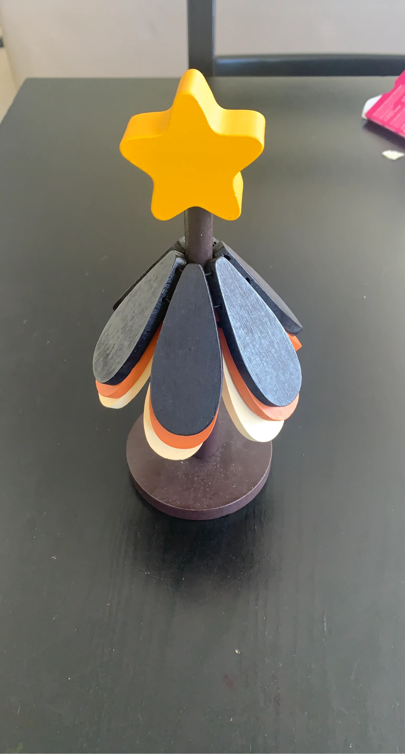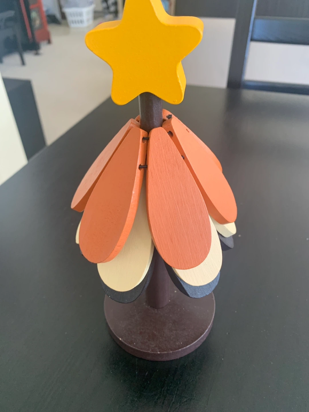 Set of 3 wooden coasters in flower shapes/Christmas tree, along with a decorative yellow star topper on a stand. One coaster is black, one is orange, and one is beige. They're designed to protect surfaces from hot or cold items. This item is handmade and brand new.