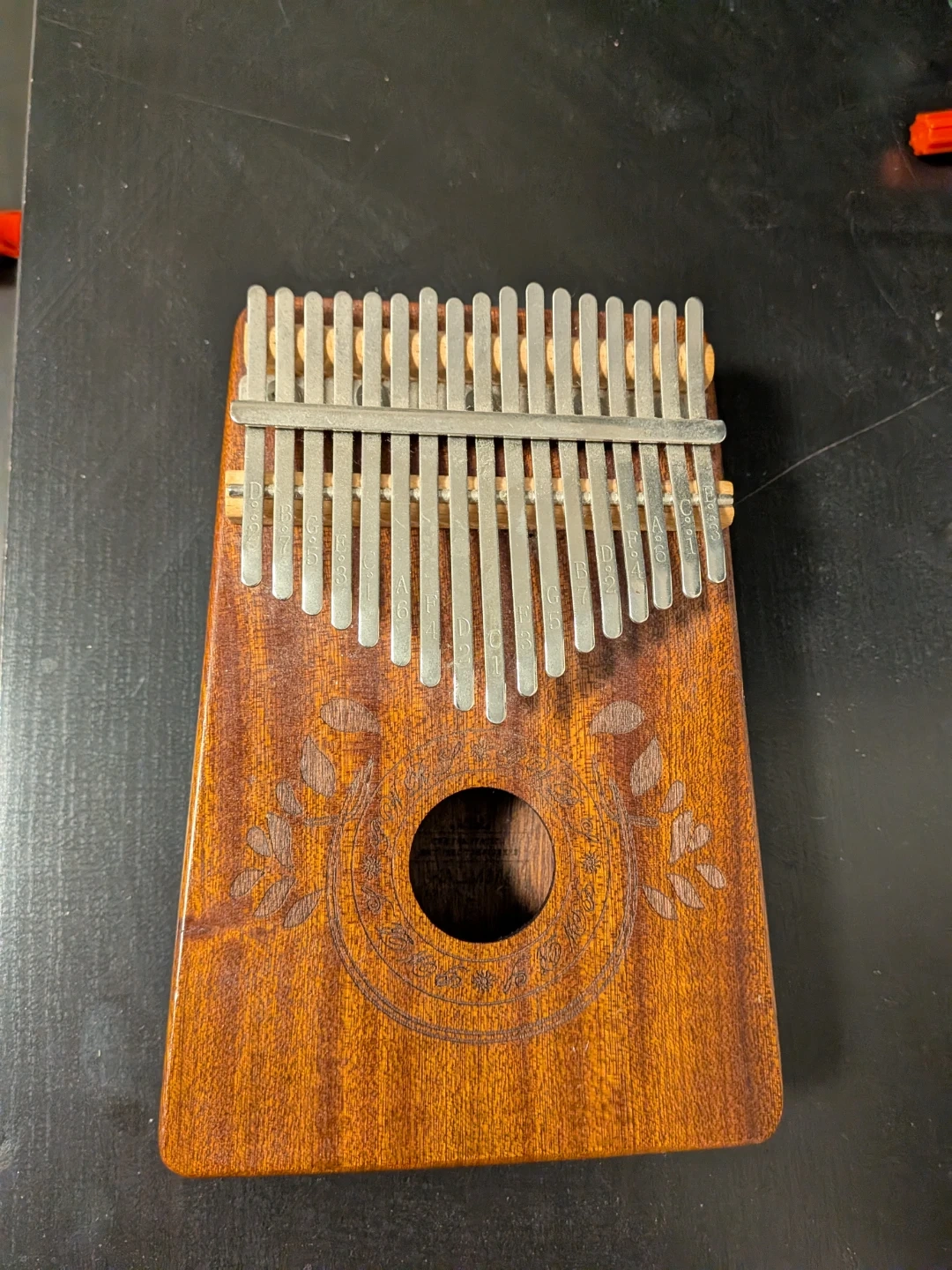 This is a 17-key Kalimba thumb piano. It's made of wood with metal tines. Notes are engraved on the tines for easy playing. It has a round sound hole on the front.