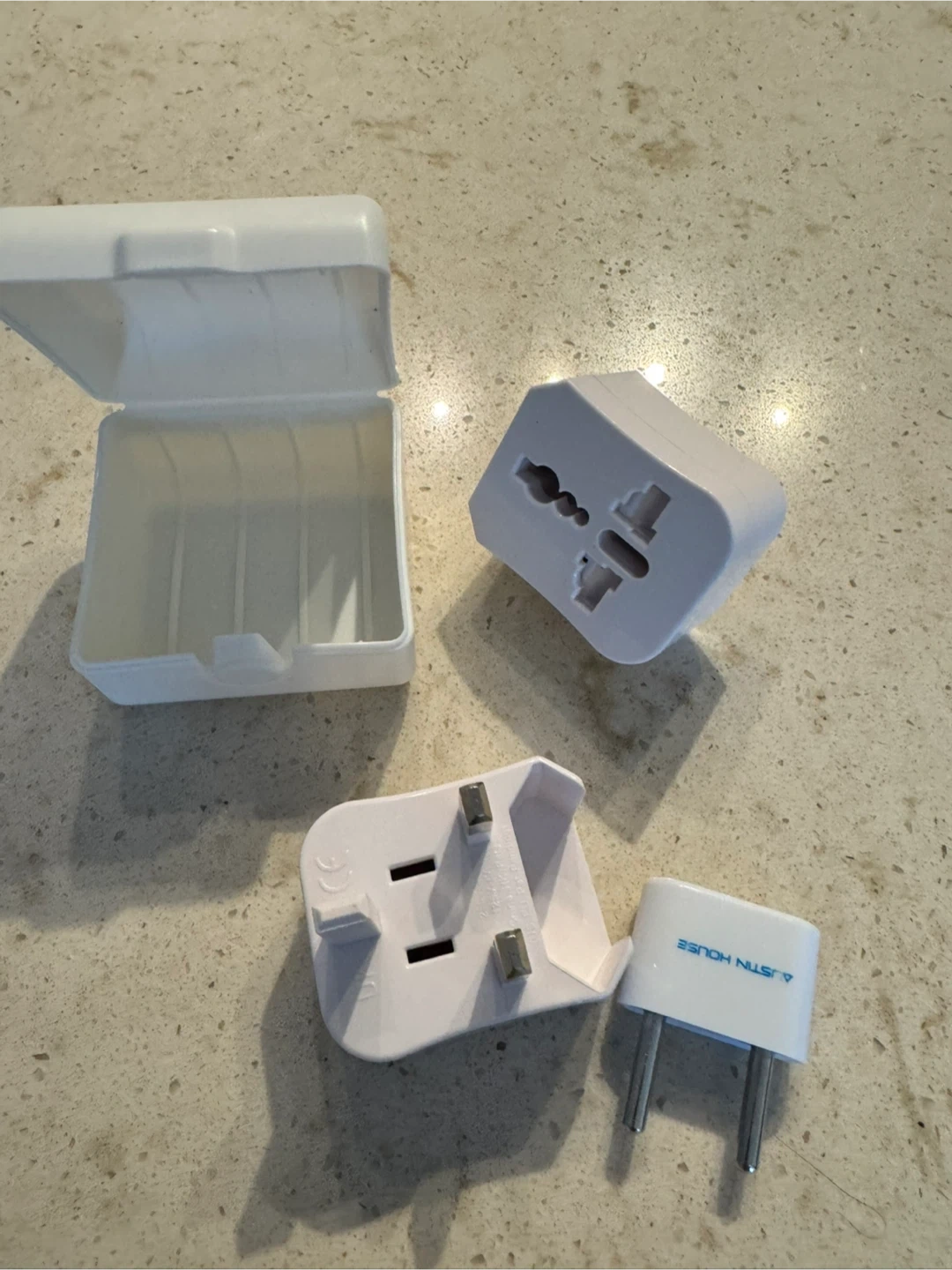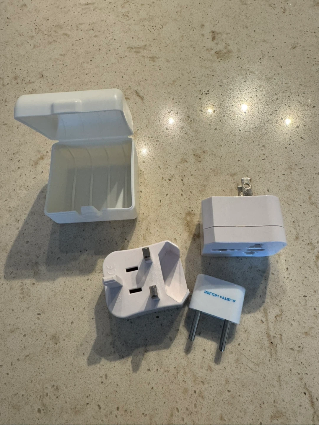This is a white universal travel adapter set, including a main adapter and three interchangeable plug types. It also comes with a white carrying case. This adapter set is handy for international travel.