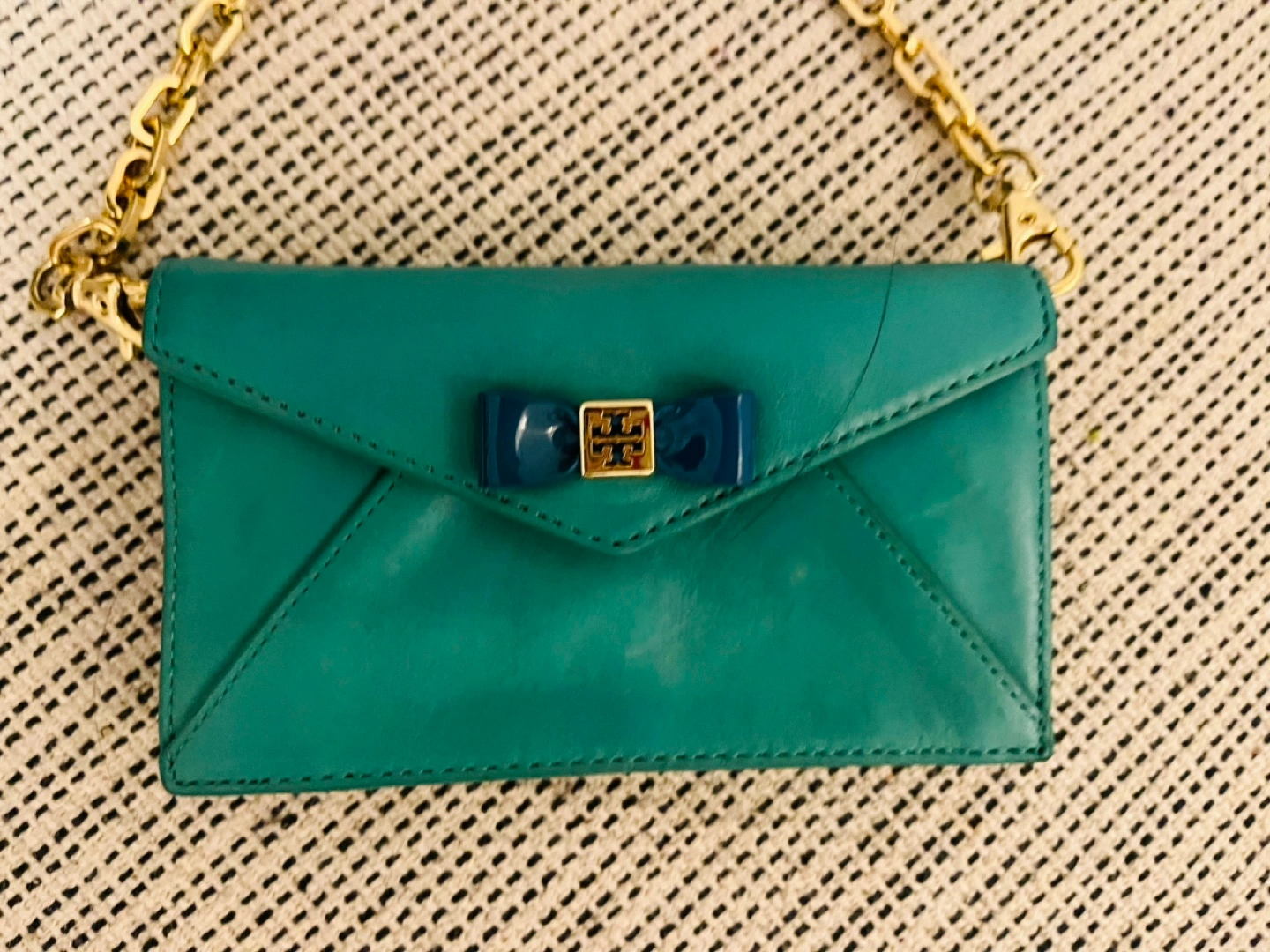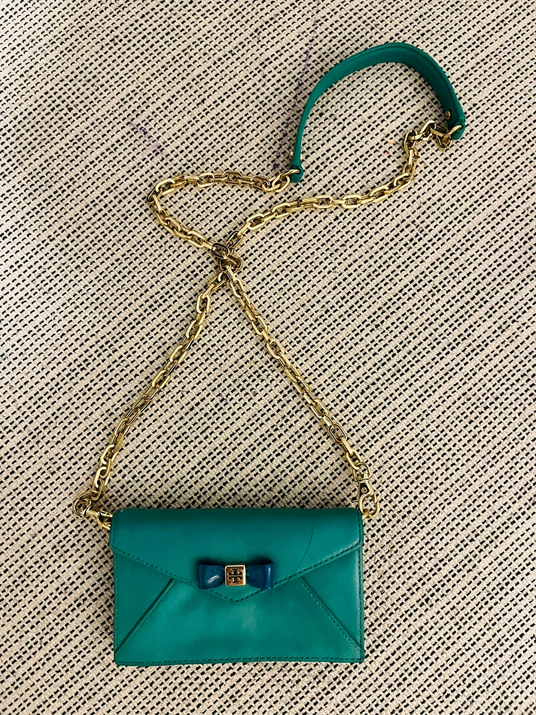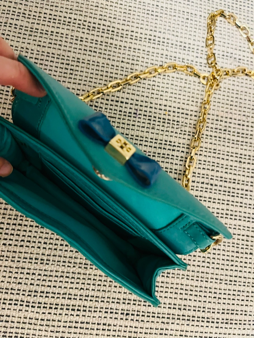 Teal leather crossbody clutch. Gold chain strap. Envelope style. Small bow detail. Multiple card slots inside.