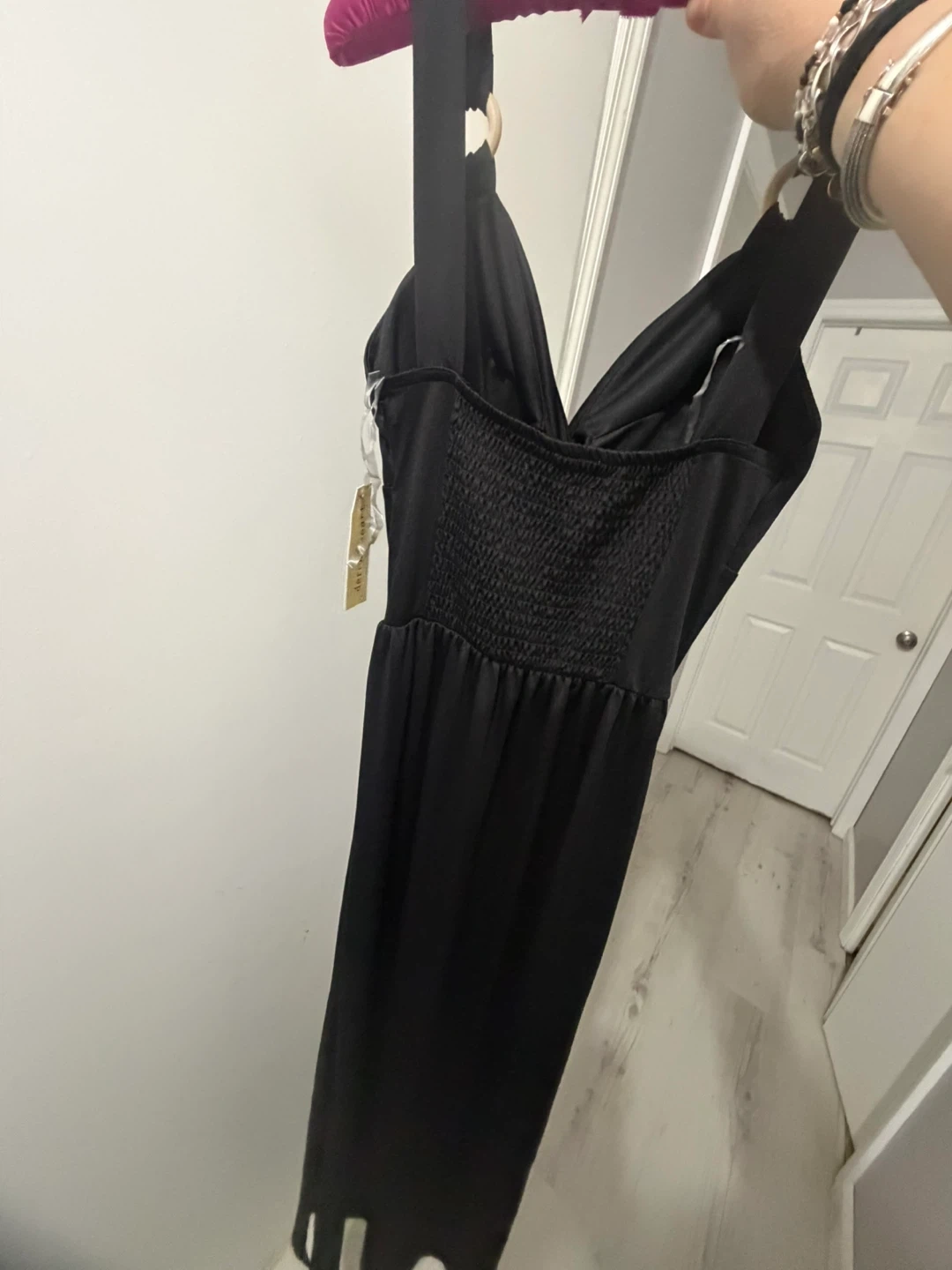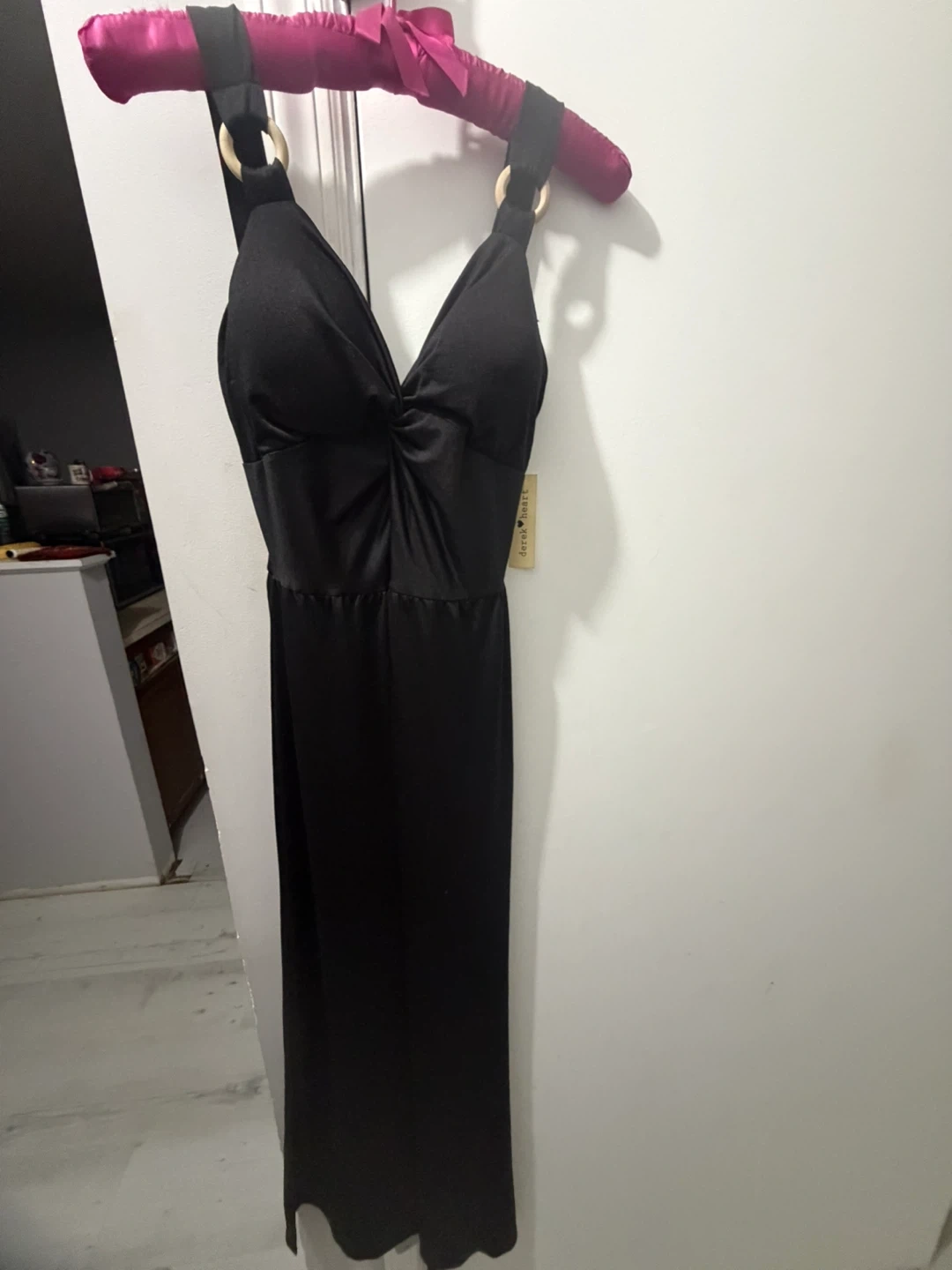 Chic black Derek Heart maxi dress featuring a flattering knotted front and wooden ring details on the straps. It's made with a stretchy, smocked back panel for a comfortable fit. This dress is perfect for evening events or a stylish day out! ideal for summer