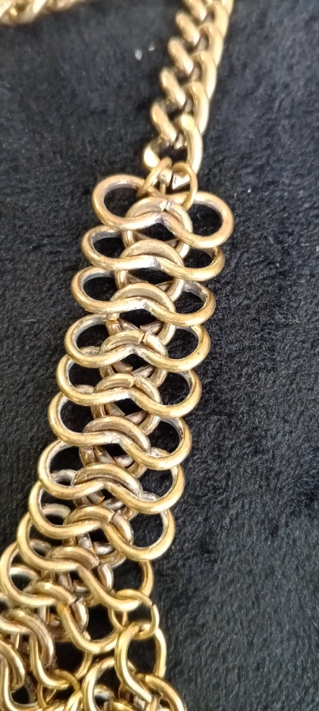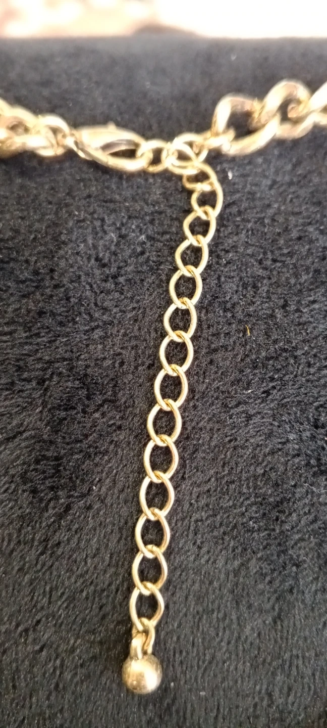 This gold-tone necklace features a multi-layered chain design. It includes an adjustable extender chain with a clasp closure for a custom fit. This statement piece adds flair to any outfit!