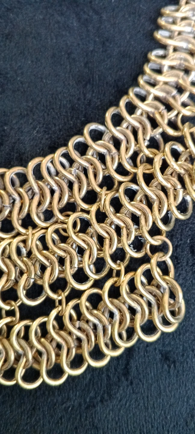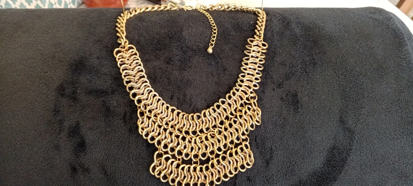 This gold-tone necklace features a multi-layered chain design. It includes an adjustable extender chain with a clasp closure for a custom fit. This statement piece adds flair to any outfit!