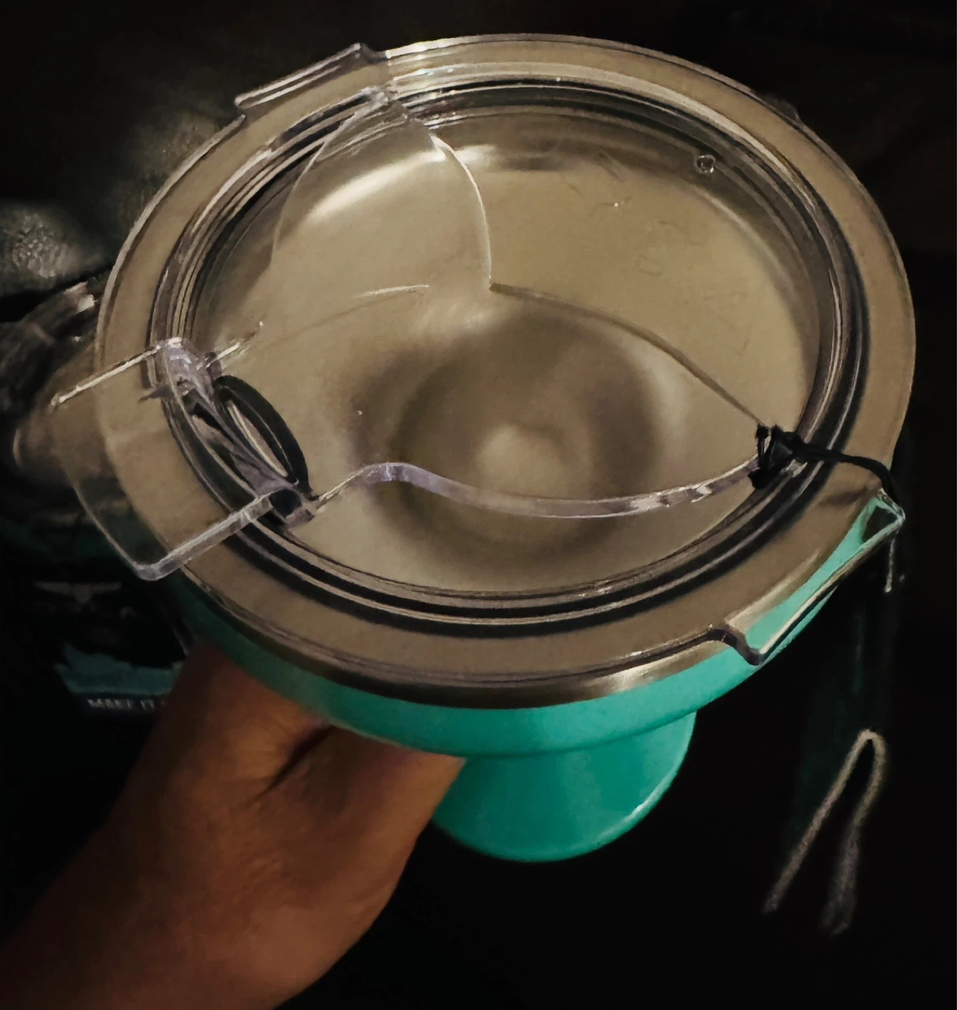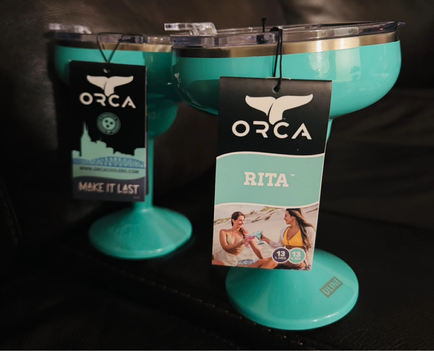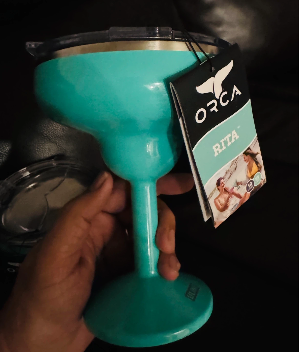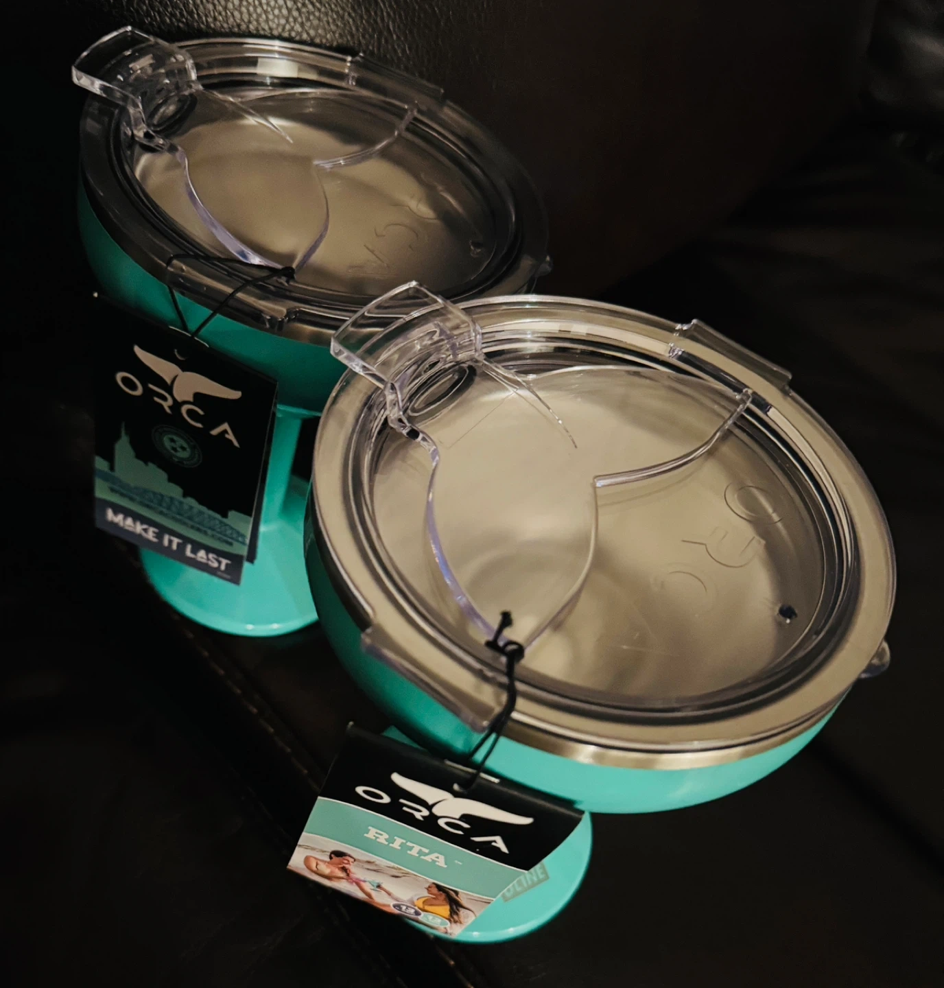 This is an ORCA Rita tumbler in a teal colour. It comes with a clear lid. Tumbler holds beverages and is made for travel.