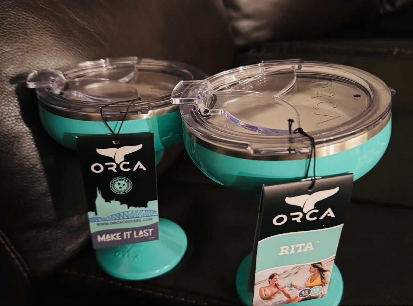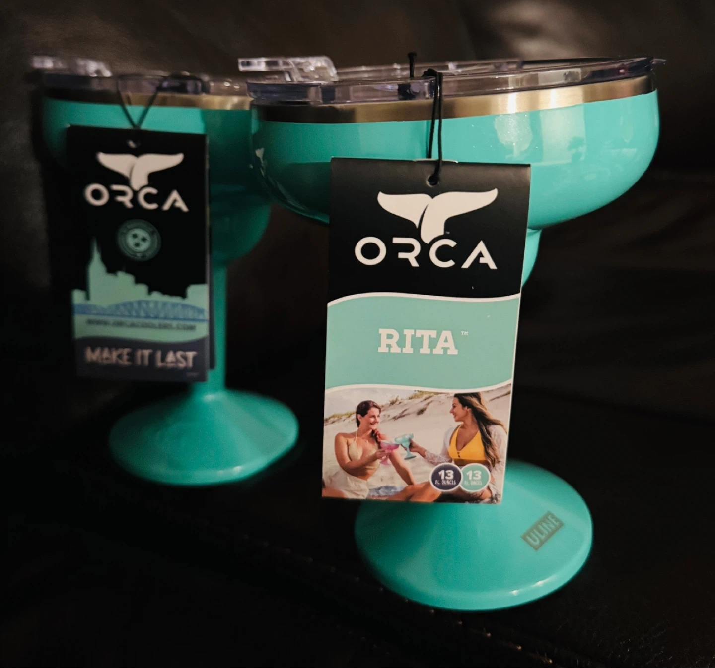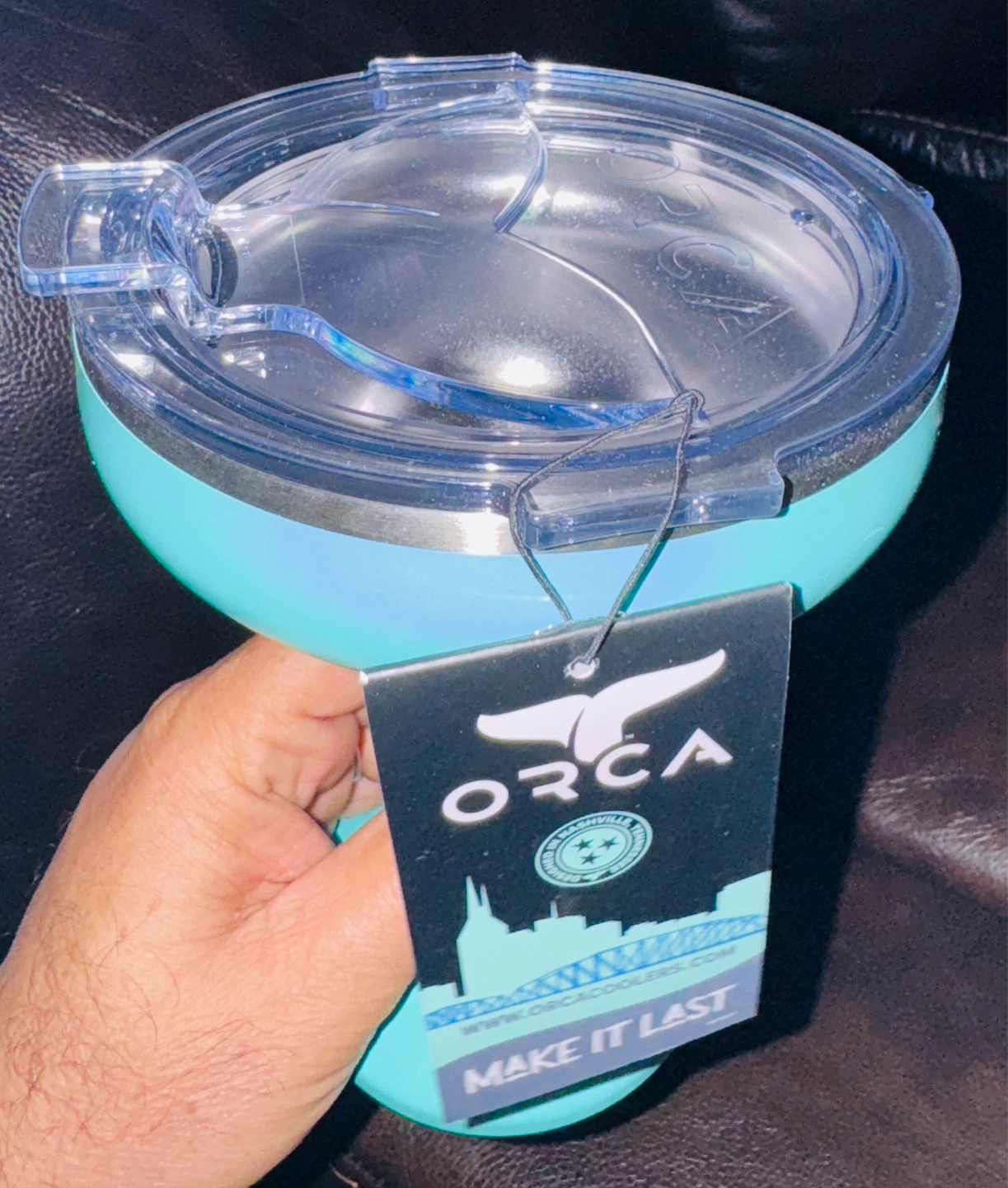 This is an ORCA Rita tumbler in a teal colour. It comes with a clear lid. Tumbler holds beverages and is made for travel.
