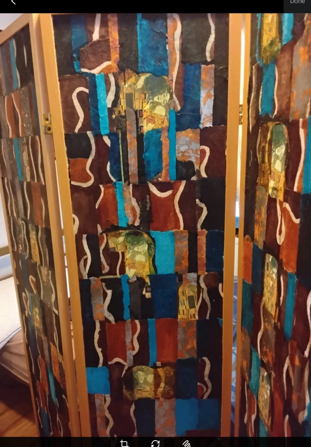 Decorative folding screen with 3 panels featuring a print inspired by Klimt's "The Kiss." It's made with textured paper collage elements in shades of brown, blue, and gold. This screen is a striking piece for dividing spaces or as a wall accent.