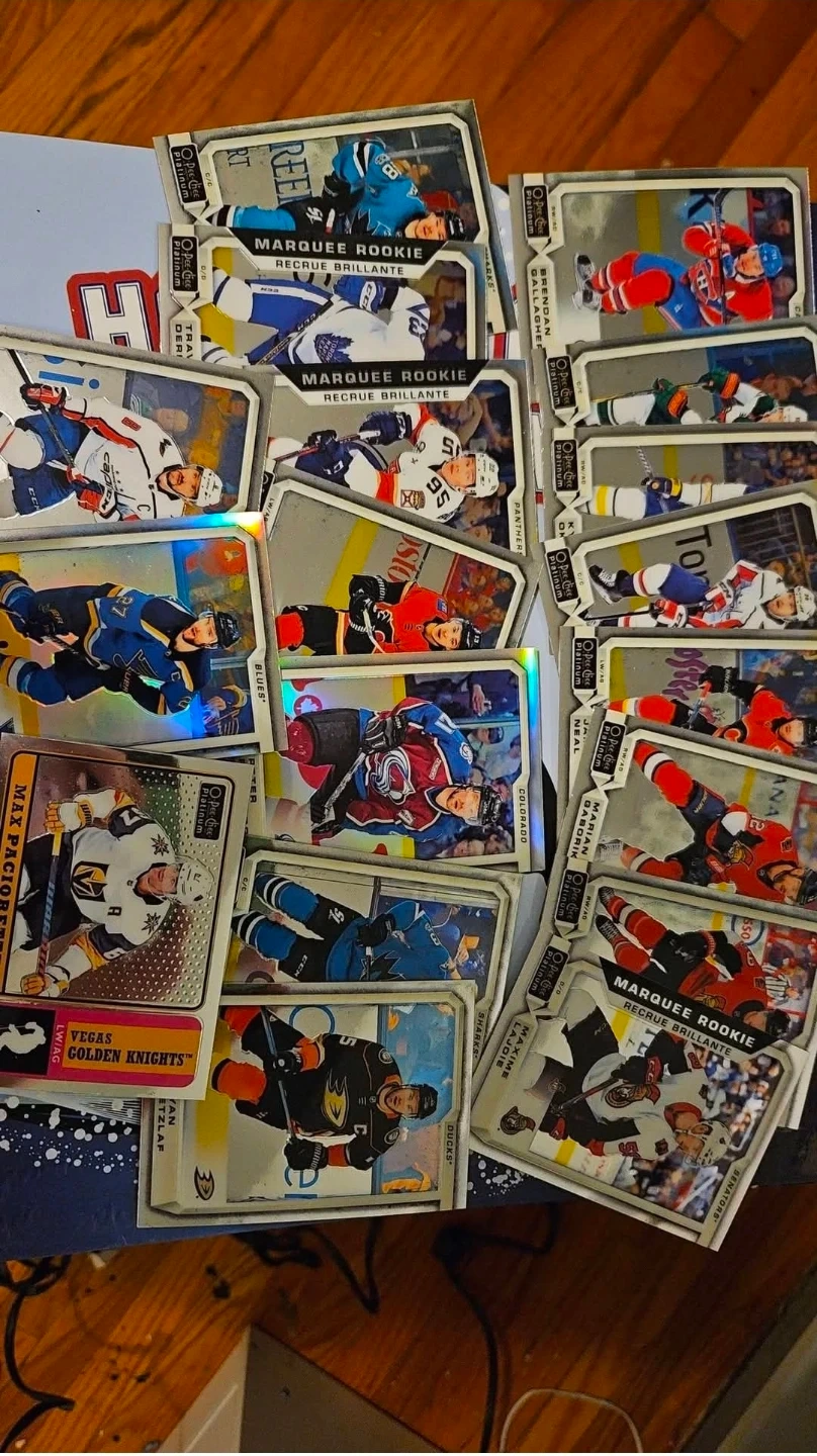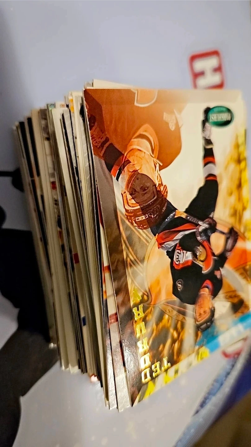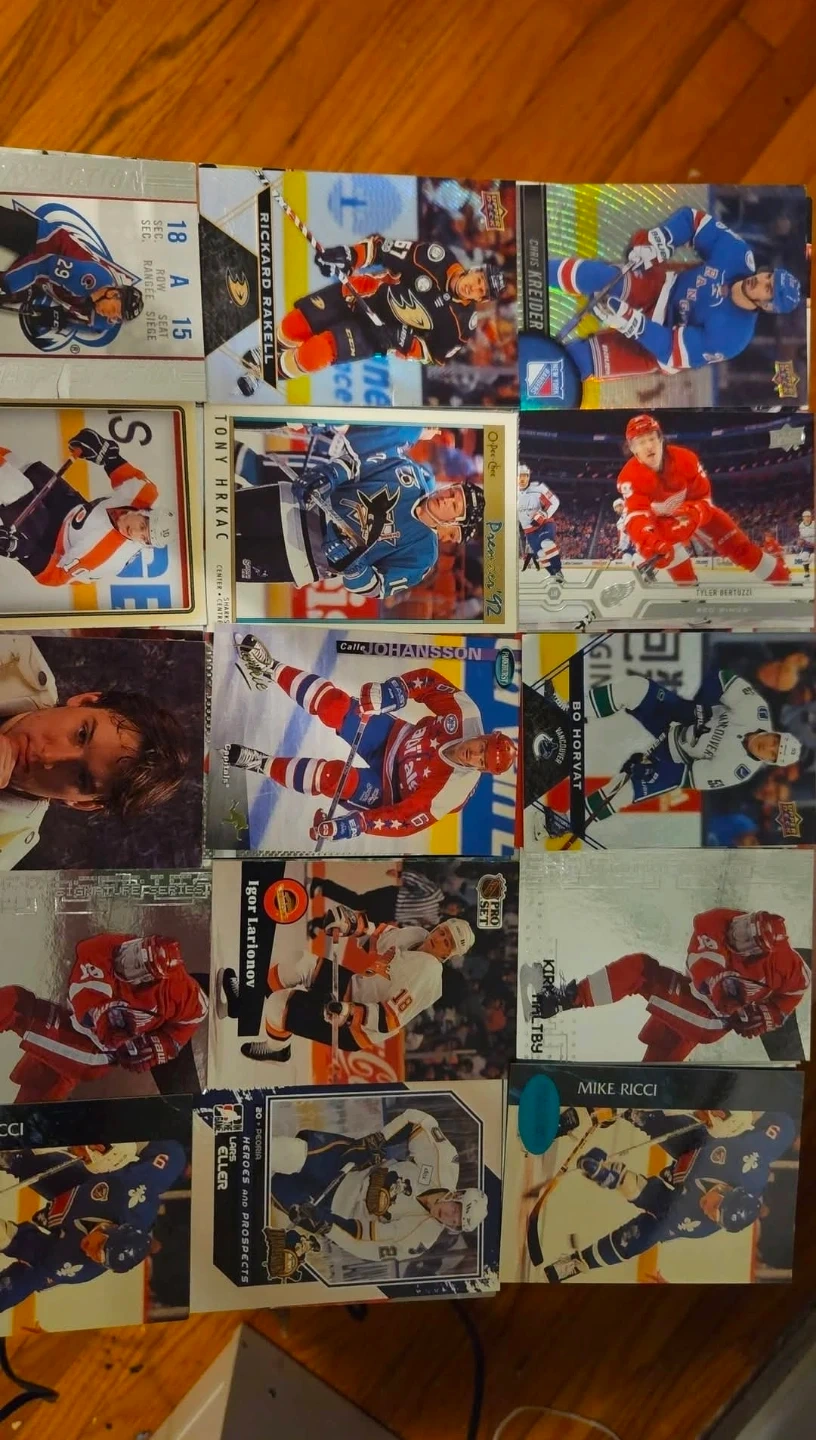 Collection of various NHL hockey cards featuring different players and teams. Cards include rookies and established stars. Great for any hockey card collector!