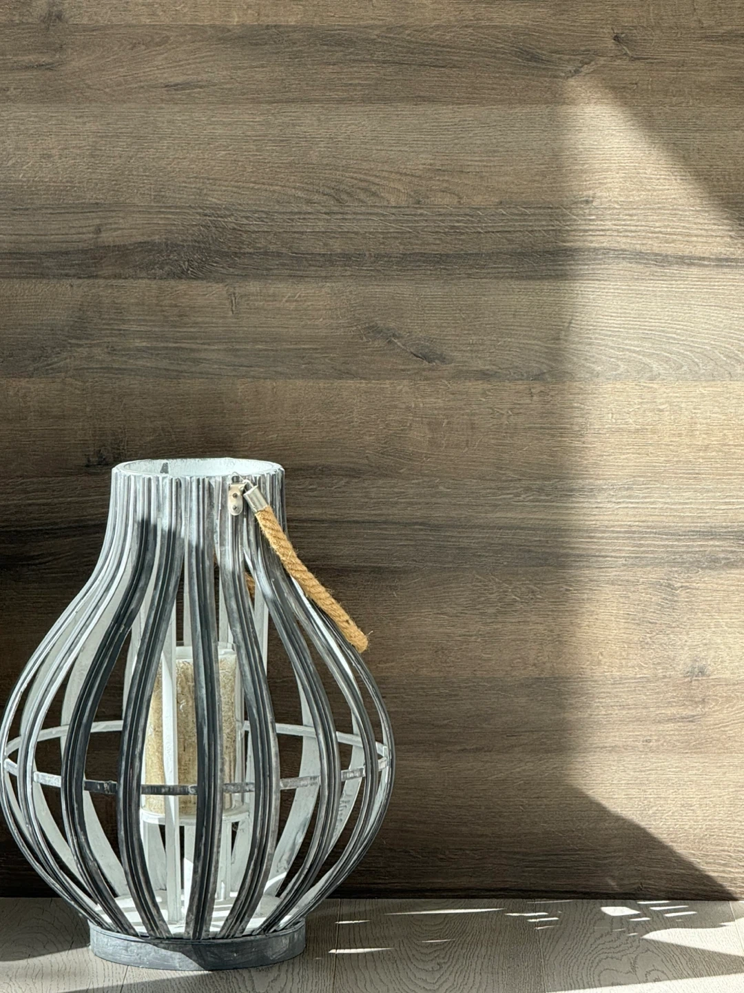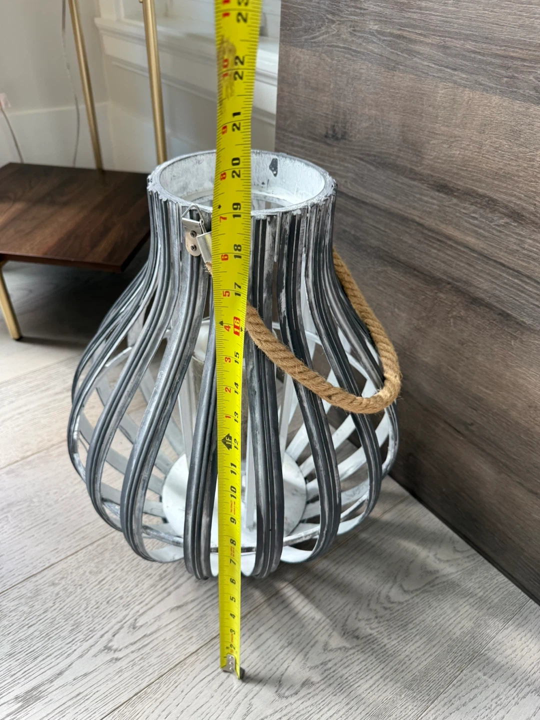 This decorative lantern features a metal frame with a weathered grey finish and a rope handle. It comes with a pillar candle holder inside. The lantern measures approximately 15 inches in height and 9 inches in width. It's perfect for adding a cozy ambiance to any room or outdoor space!