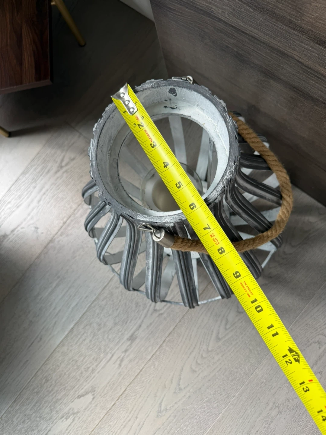 This decorative lantern features a metal frame with a weathered grey finish and a rope handle. It comes with a pillar candle holder inside. The lantern measures approximately 15 inches in height and 9 inches in width. It's perfect for adding a cozy ambiance to any room or outdoor space!