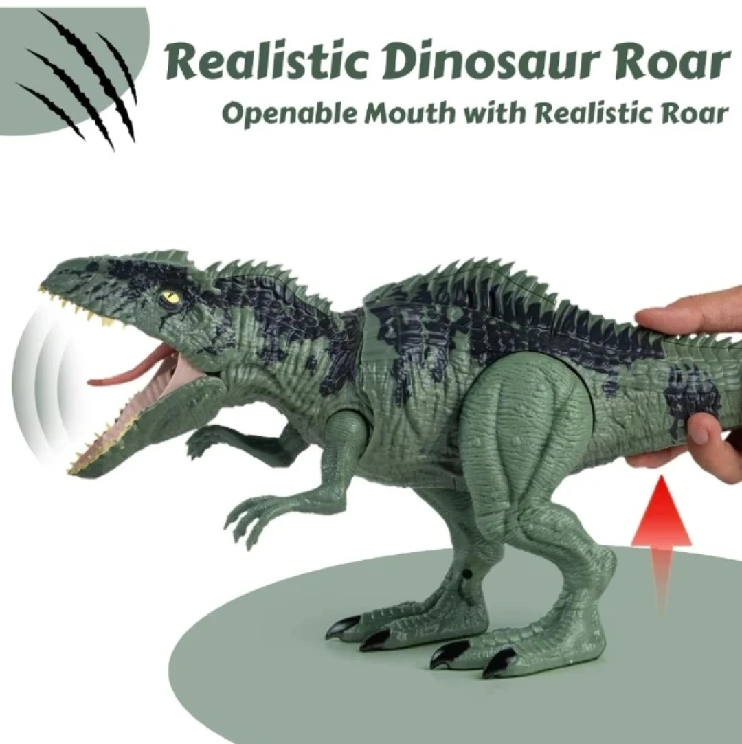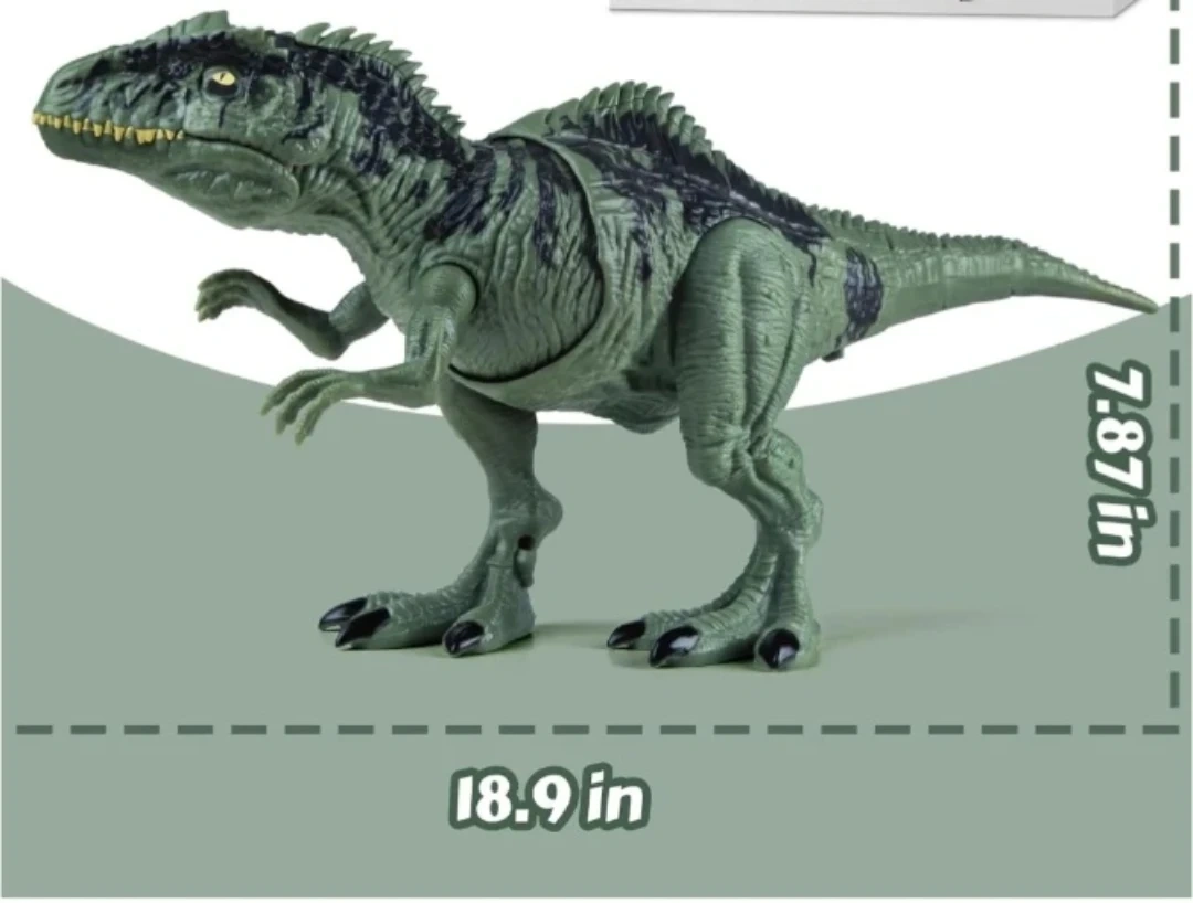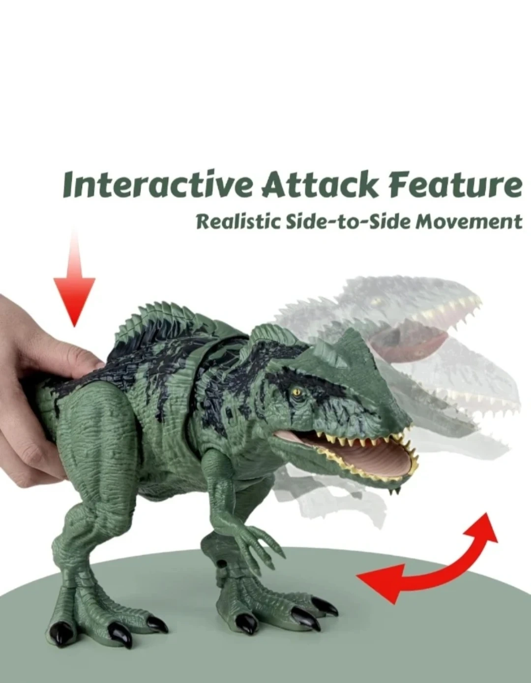 This realistic dinosaur toy features an interactive attack mode with side-to-side movement. It has an openable mouth with a realistic roar sound. Measures 18.9 inches long and 7.87 inches high.