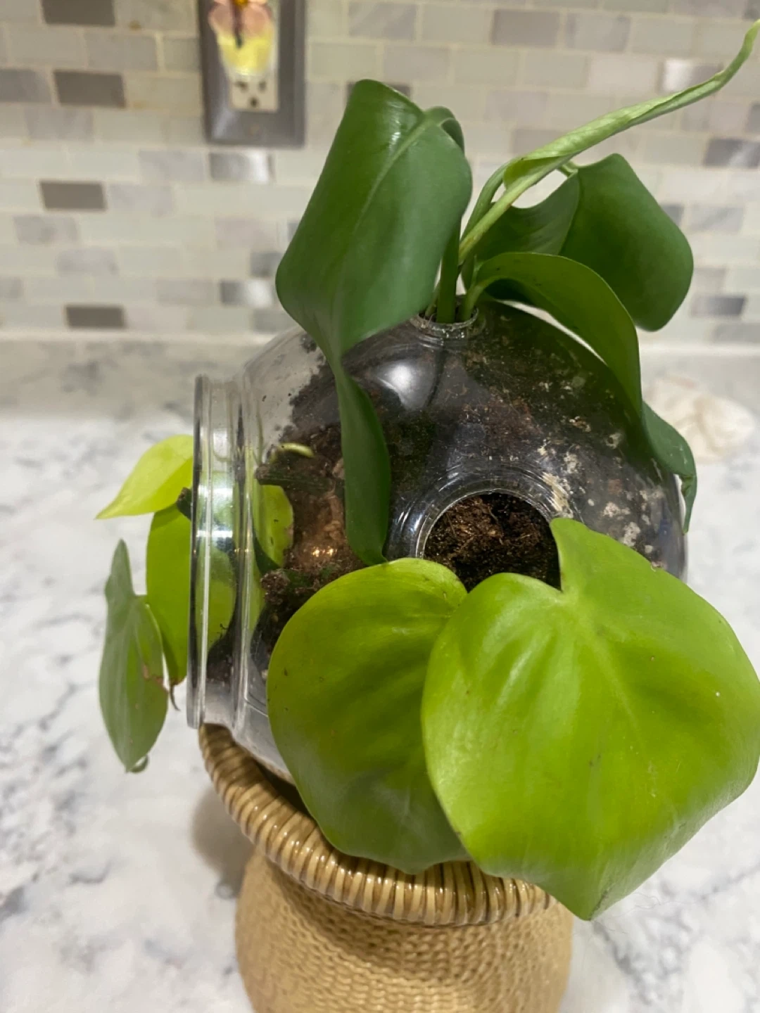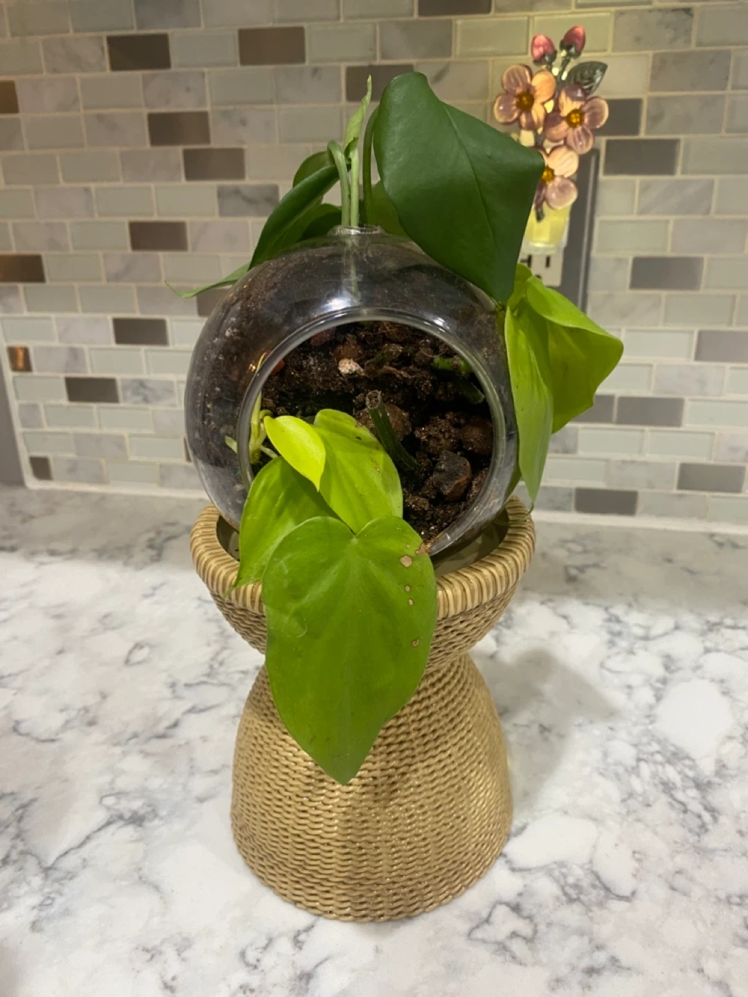 This unique glass terrarium houses healthy green plants in soil. It's displayed in a rustic woven stand. It's perfect for adding a touch of nature to any space!