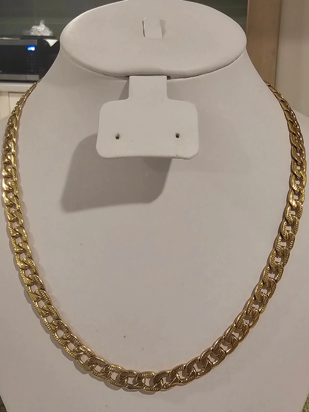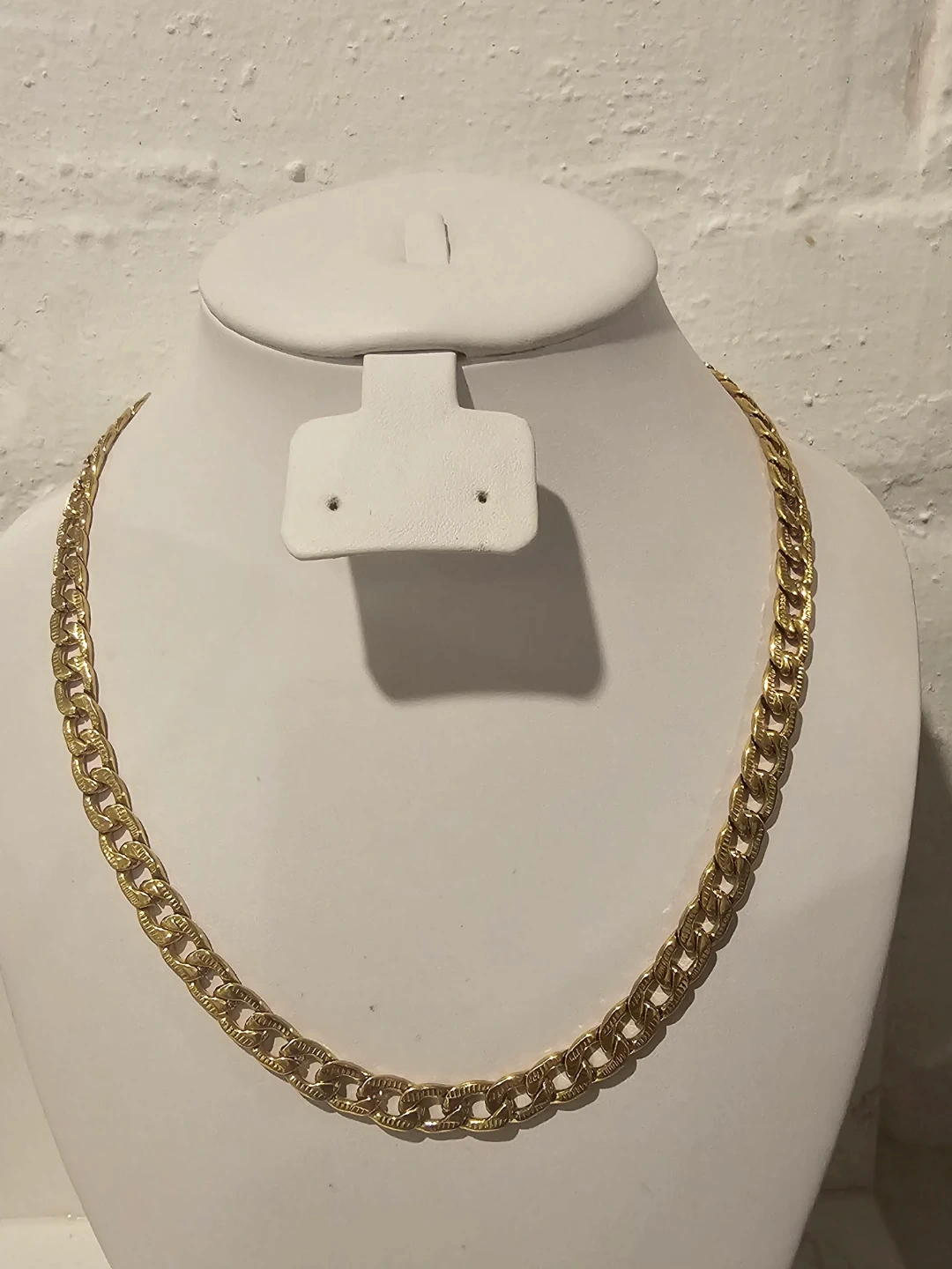 This is a classic gold tone curb link chain necklace. It's approximately 20 inches long with a lobster clasp closure. This necklace adds a touch of shine to any outfit!