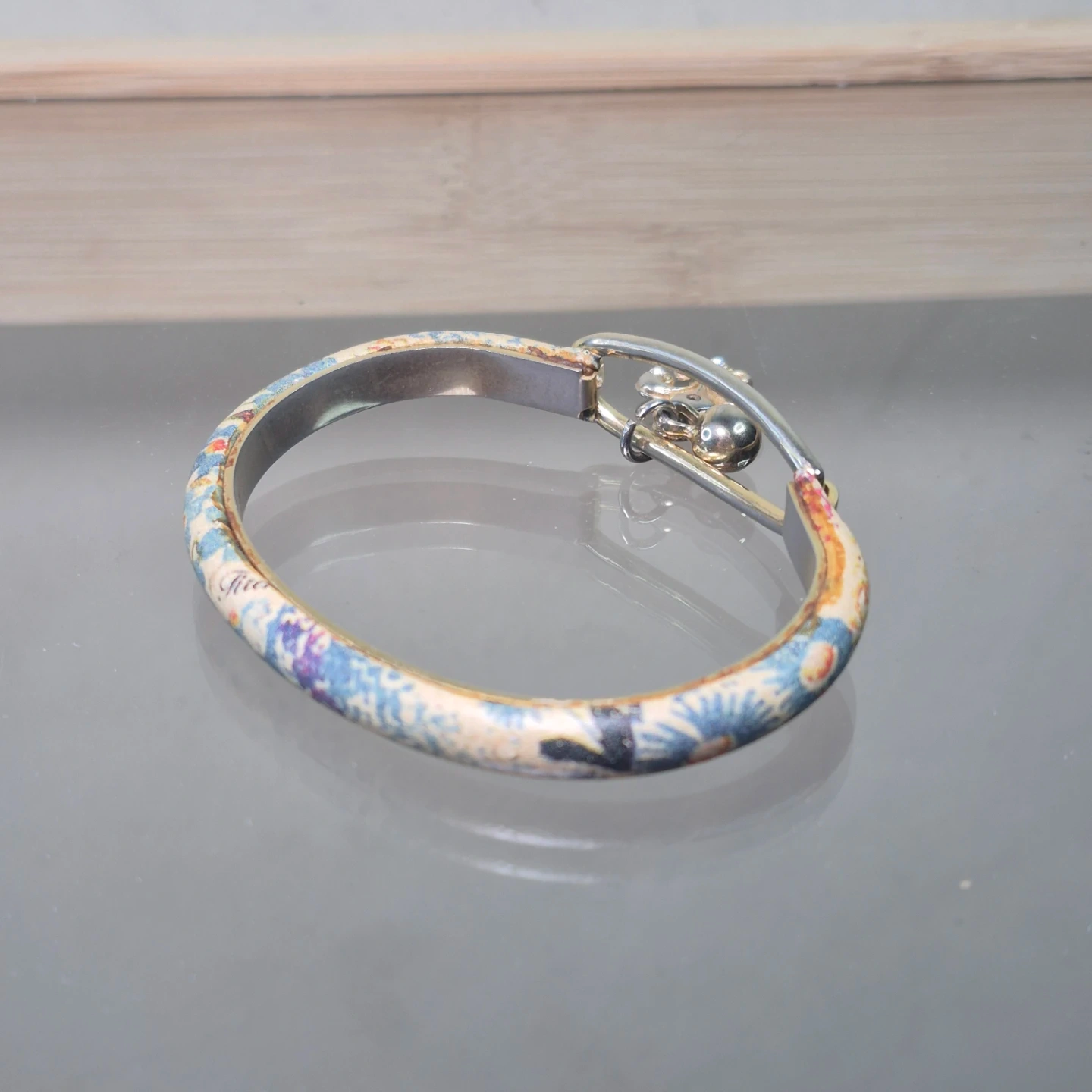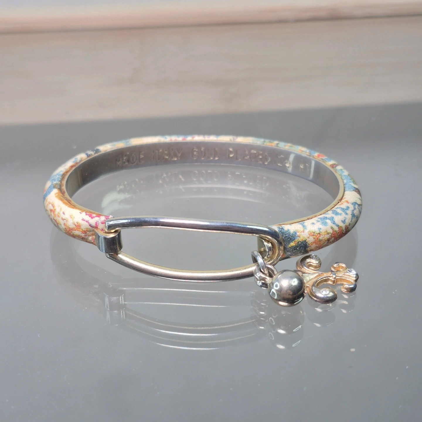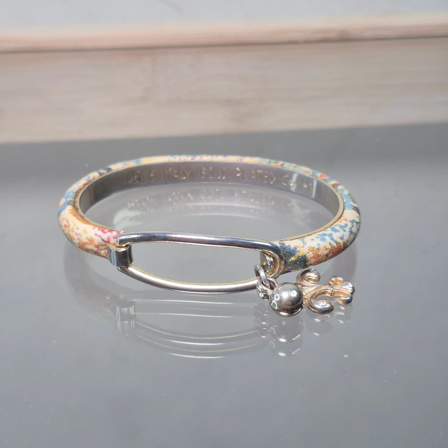 This is a gold-plated bangle bracelet made in Italy. It features a colourful abstract pattern and a decorative charm with a fleur-de-lis accent. The bracelet has a secure clasp closure.