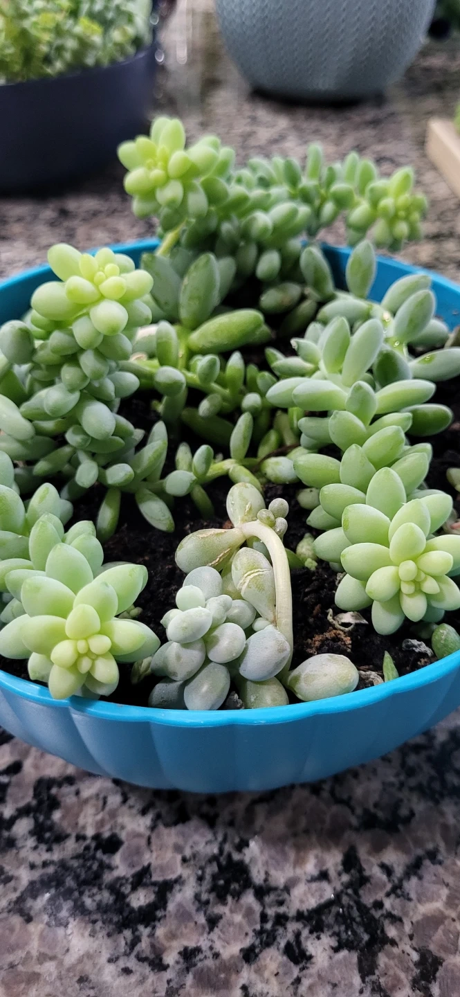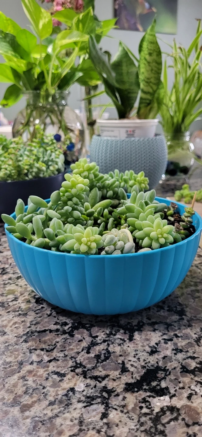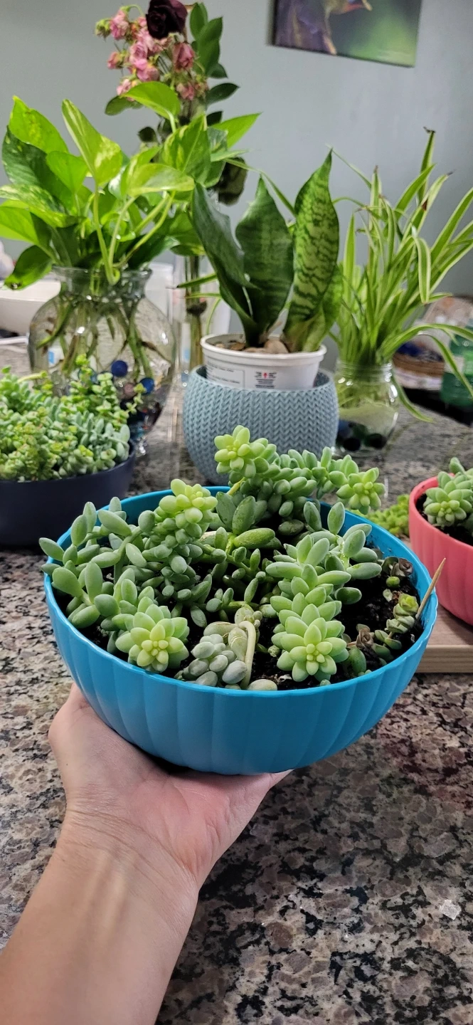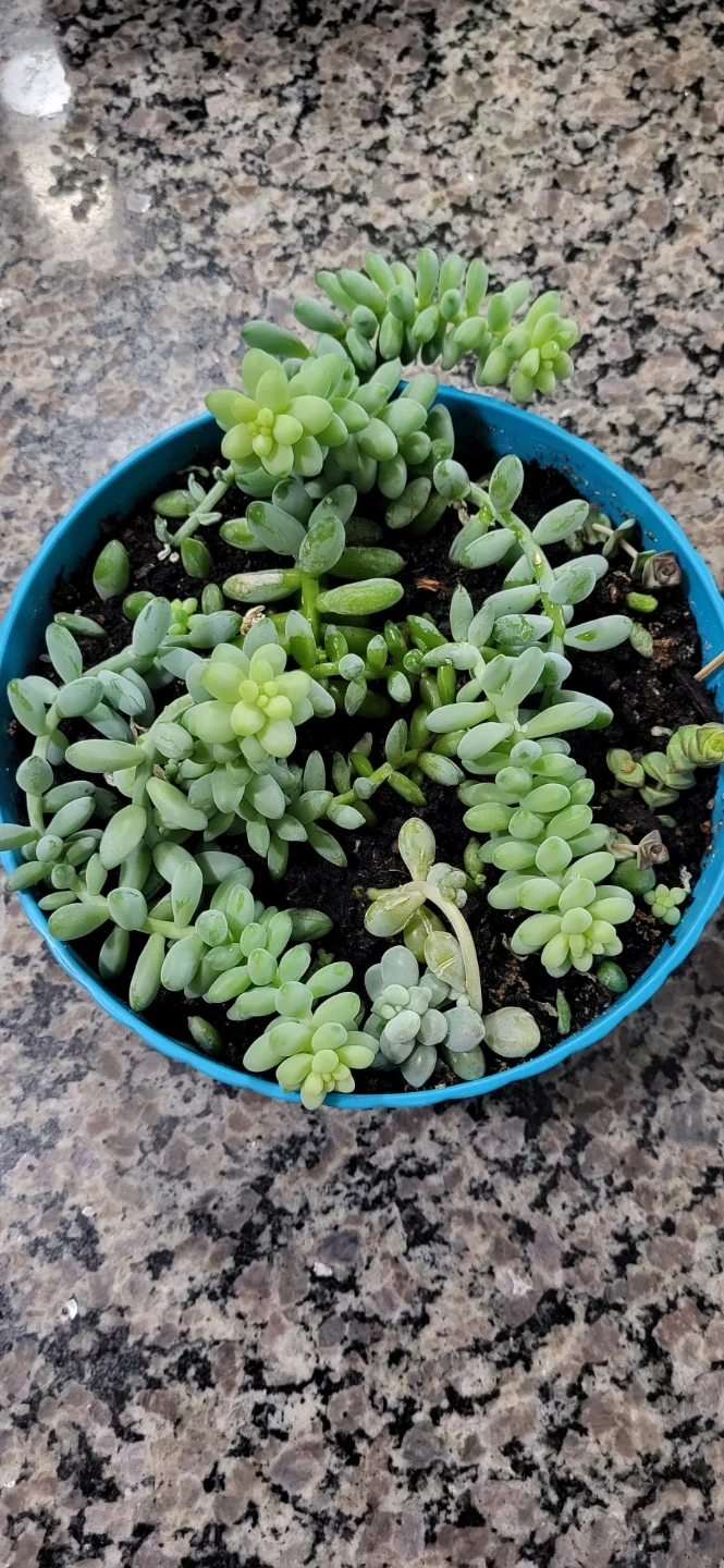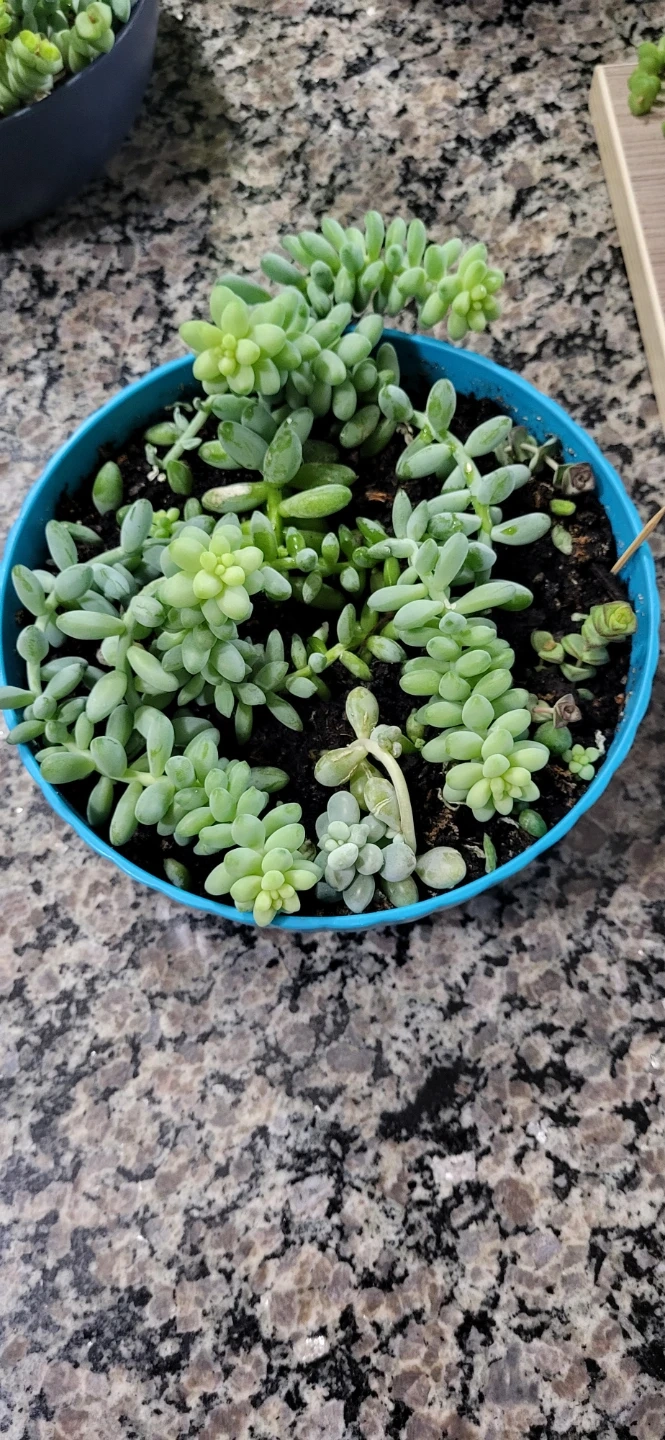 Three types of succulent in a cute plastic pot: Baby Silver Jelly Bean & Crassula perforata, majority are Burro's Tails succulent.