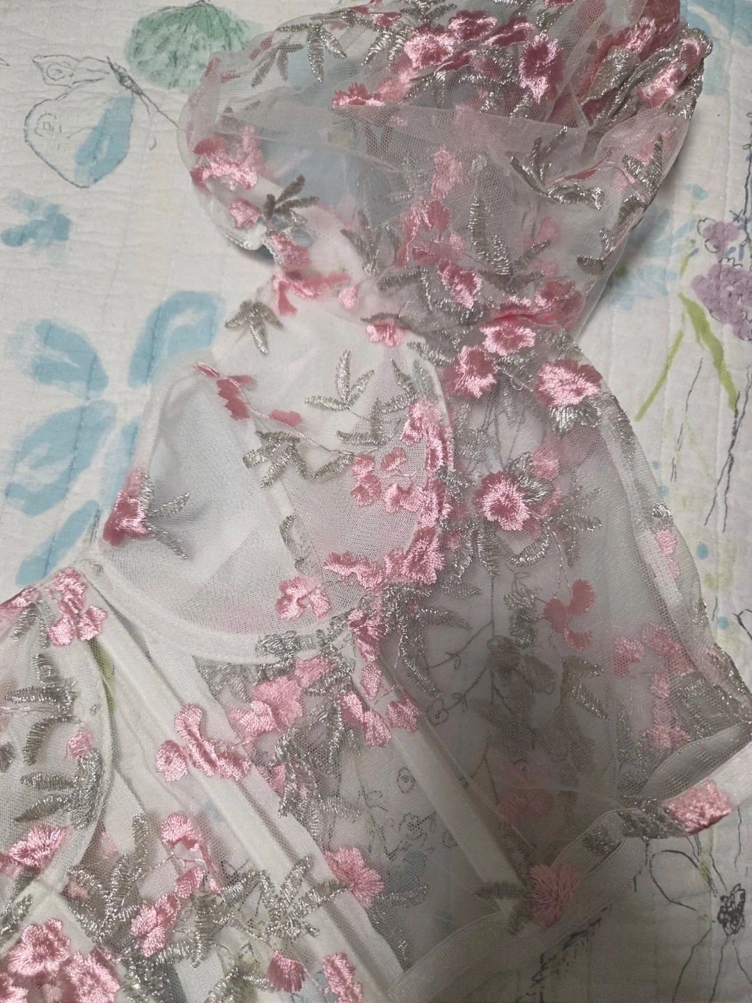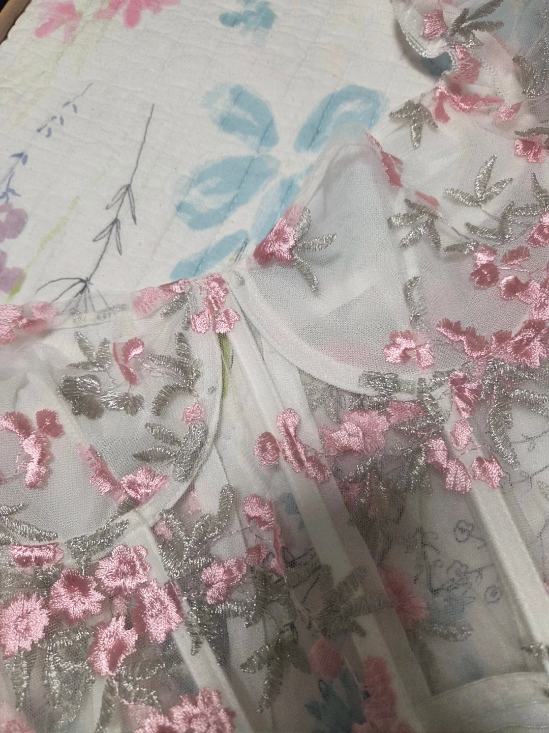 brand new never worn Sheer white corset top with delicate pink and silver floral embroidery. Features include boning for structure and adjustable straps. Fabric is a mesh-like material with embroidered details.