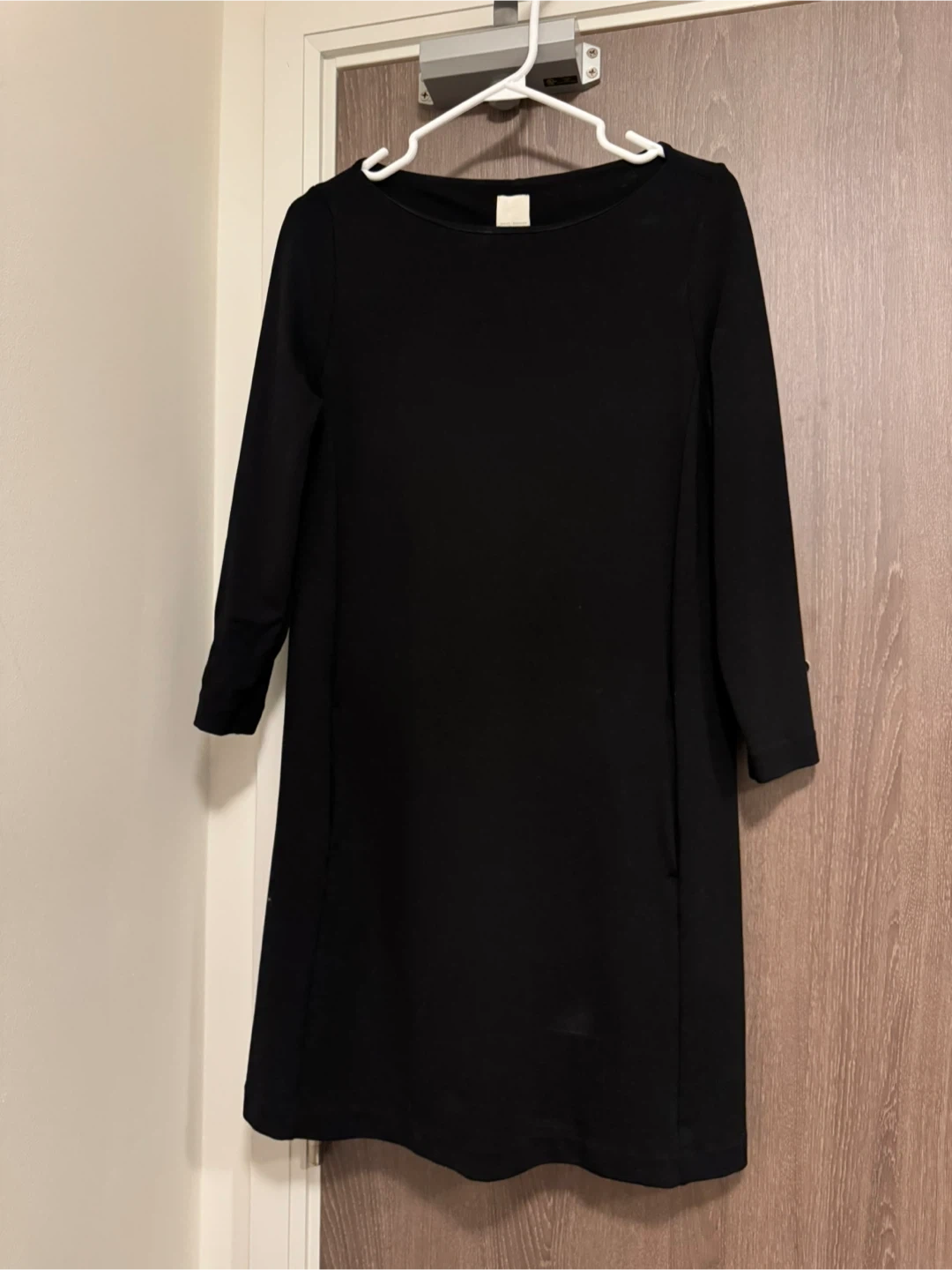 This is a black H&M Basics dress in a size S. It features 3/4 length sleeves and a simple silhouette. Very thick material.