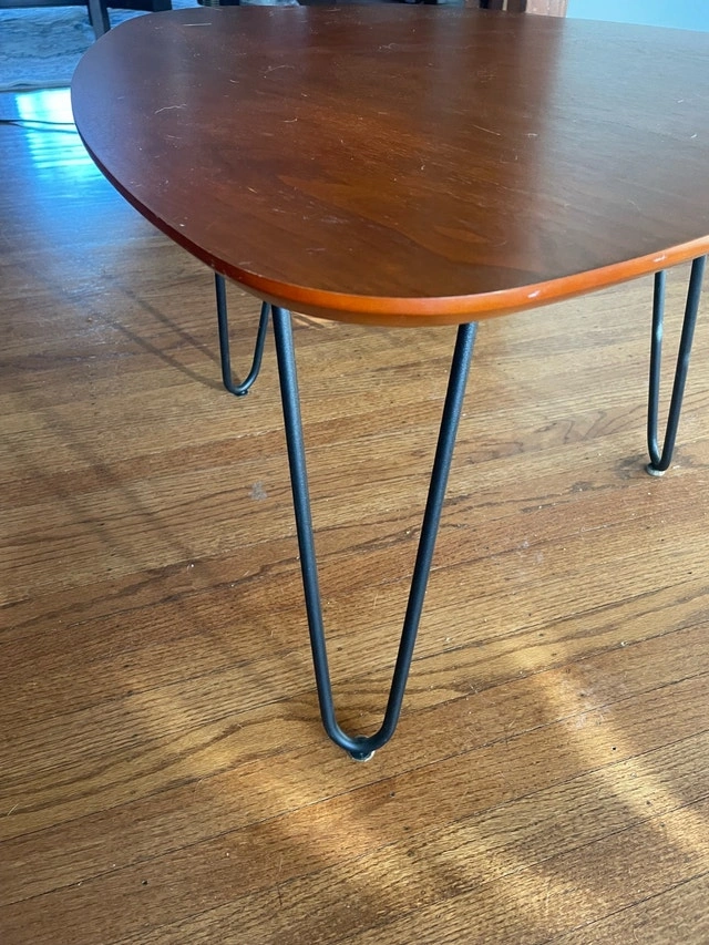 Two nesting coffee tables with a stylish mid-century modern design and triangular tops. They have a warm wood finish. If the ad is up, they're still available!