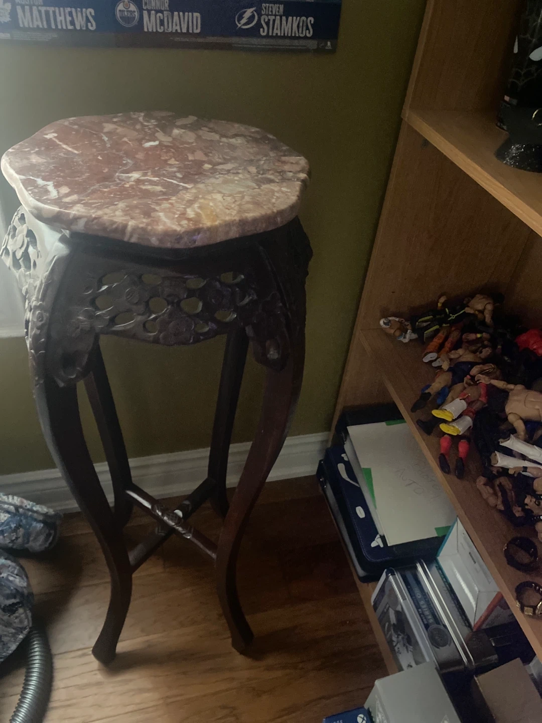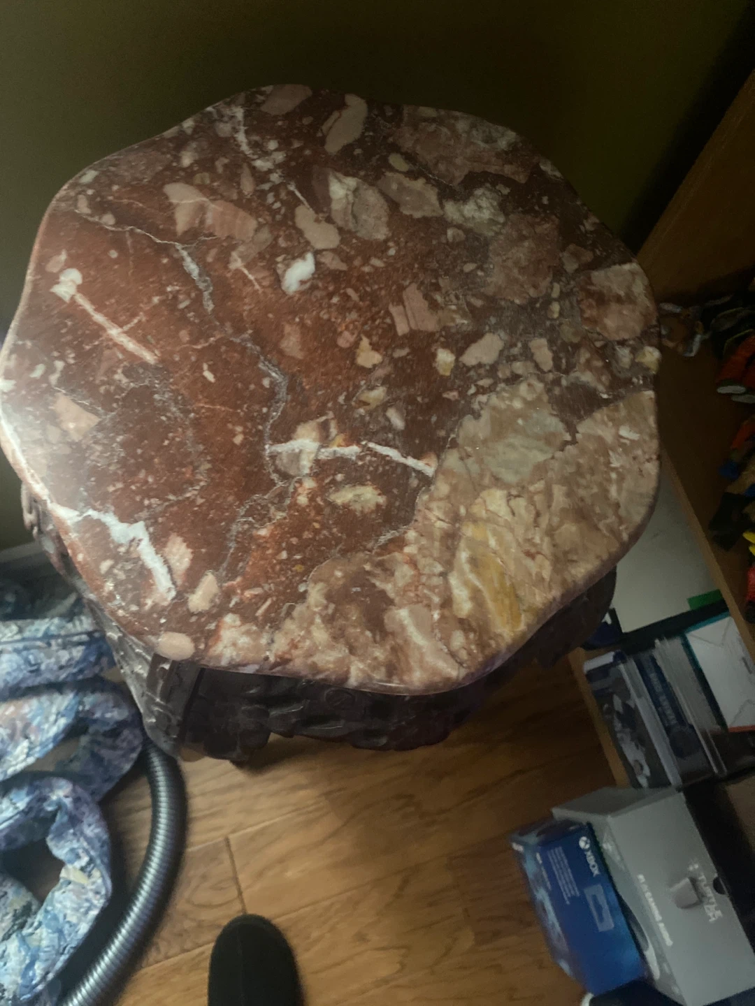 Stylish plant stand featuring a genuine marble top with unique veining. The dark wood base has intricate carvings and an open, supportive design. Perfect for displaying plants or as an accent piece.