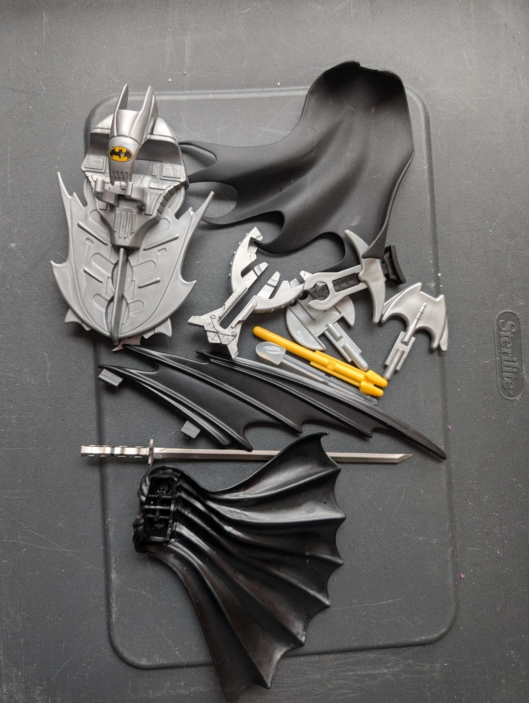 This lot includes various Batman-themed accessories, featuring two black capes and several grey and silver-coloured utility pieces. There's also a yellow accessory that looks like a grappling hook or tool. These are great for customizing action figures or for display purposes!