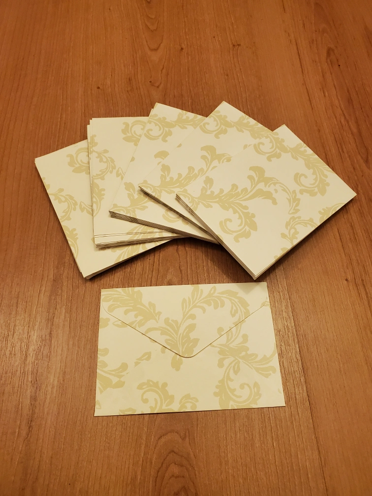 Set of envelopes with a delicate floral design. Blank inside. Great for invitations, thank you notes, or other correspondence. Qty 50