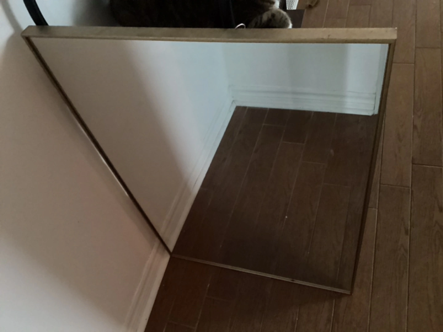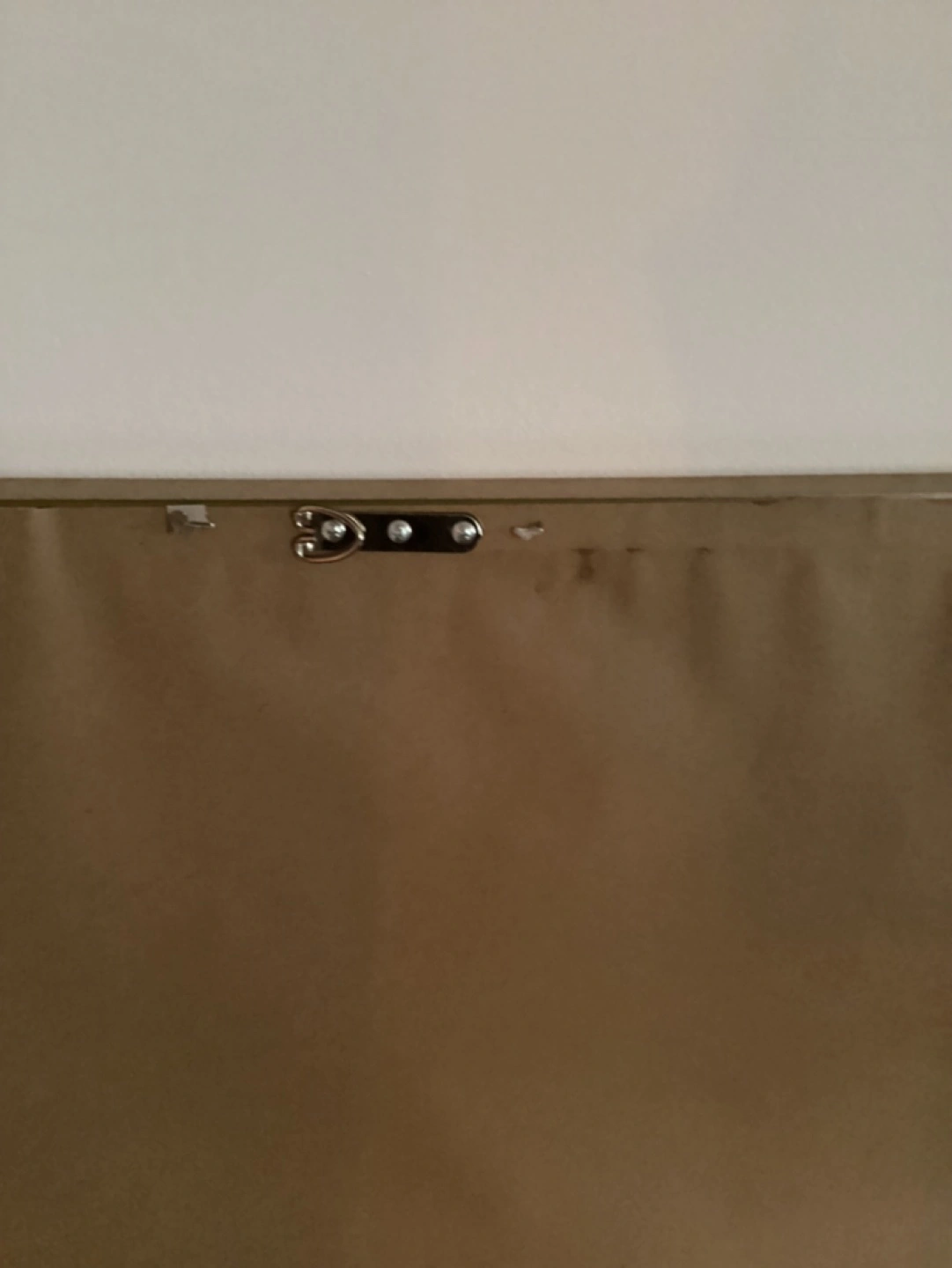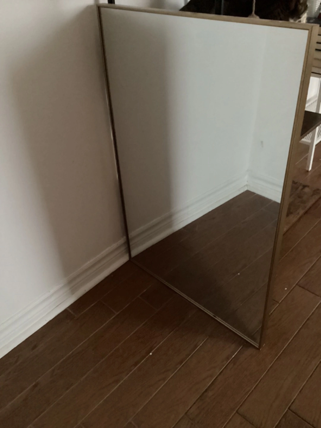 Large rectangular mirror has a thin gold-toned metal frame. It's ready to hang with D-rings on the back. It's perfect for adding a touch of style to any room!