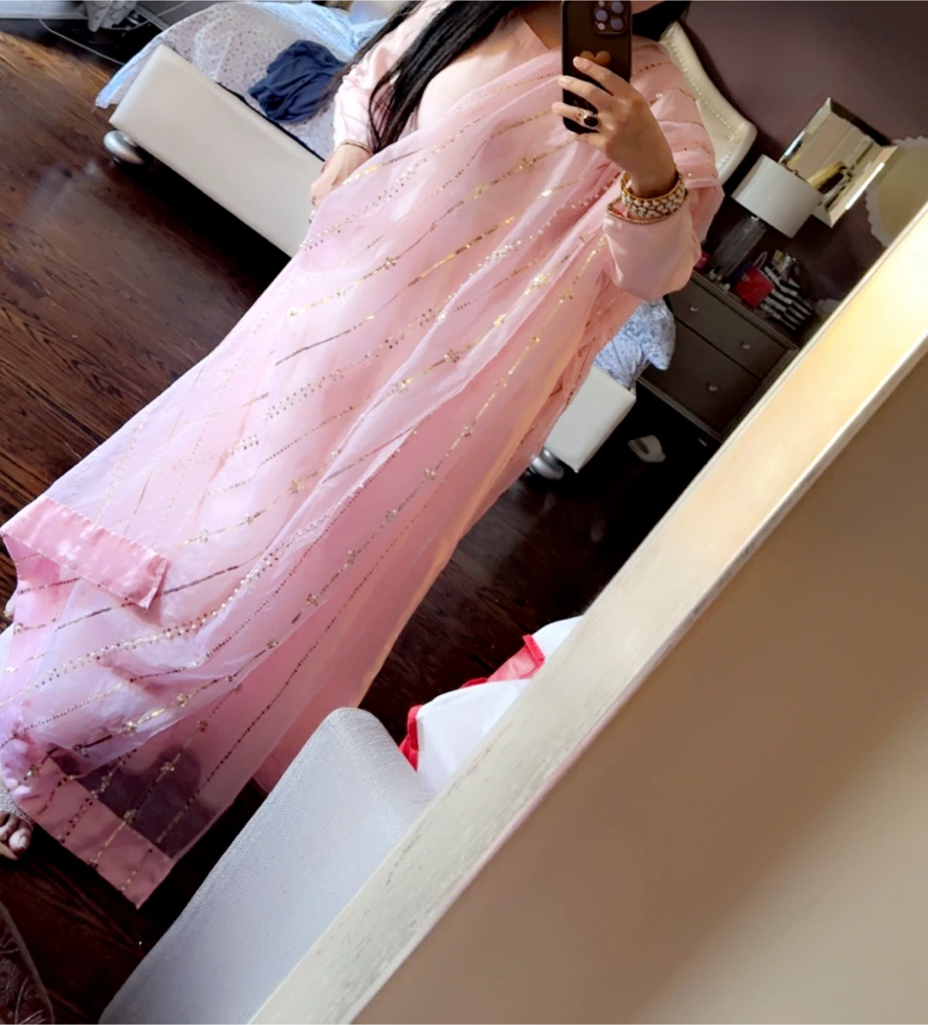 Beautiful pink maxi with delicate gold sequin and thread detailing dupatta. It's made from a sheer fabric with a satin border. This dress is perfect for special occasions or to add a touch of elegance to any outfit!