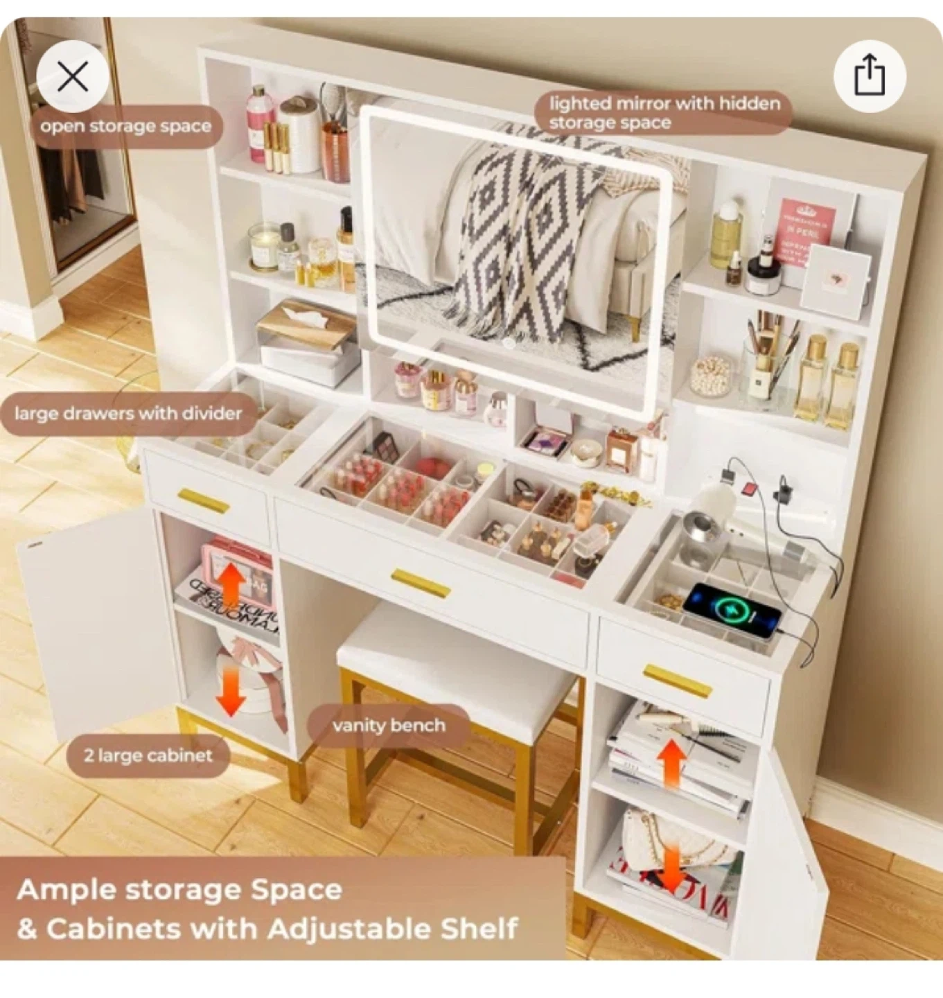 Vanity Set with lighted mirror, glass top, drawers, built-in outlet, and an upholstered stool.