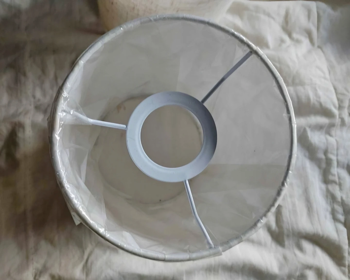 Small white lampshade with a metal frame inside. Still has clear plastic cover on it. Suitable for bedside lamp or smaller sized lamp