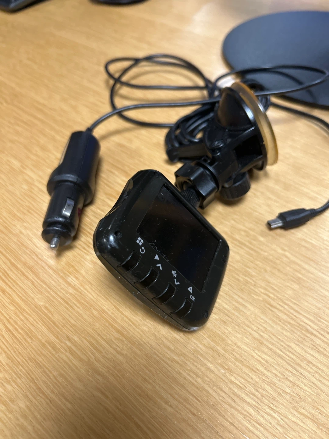 This is a black Nexigo dash cam. It comes with a car charger and a suction cup mount. Record your drives easily with this compact camera!